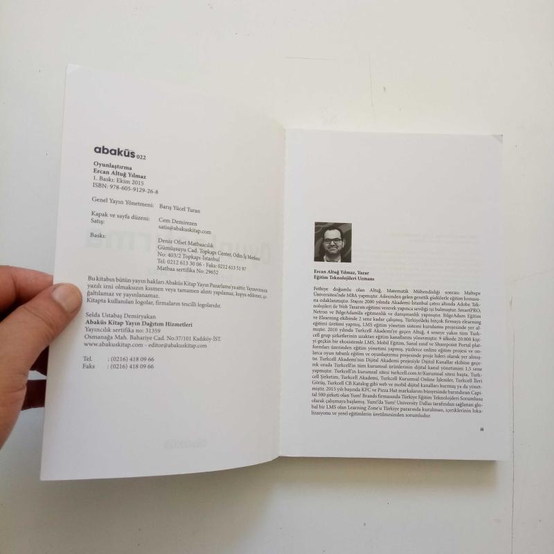 OYUNLAŞTIRMA / İŞİNİZE VE HAYATINIZA OYUN KATIN (2.EL), ERCAN ALTUĞ YILMAZ tarafından kaleme alınmıştır. Eser BARIŞ YÜCEL TURAN editörlüğünde hazırlanmıştır. Kitap 2015 yılında ABAKÜS KİTAP tarafından [ İSTANBUL] 978-605-9129-26-8 ISBN kodu ile yayınlanmıştır. Satışta olan kitap, yayınevinin 1. baskısıdır. 358 sayfadır. Sayfa bilgisi 1. HAMUR olarak belirtilmiştir. OYUNLAŞTIRMA / İŞİNİZE VE HAYATINIZA OYUN KATIN (2.EL) adlı eser Türkçe dilindedir.