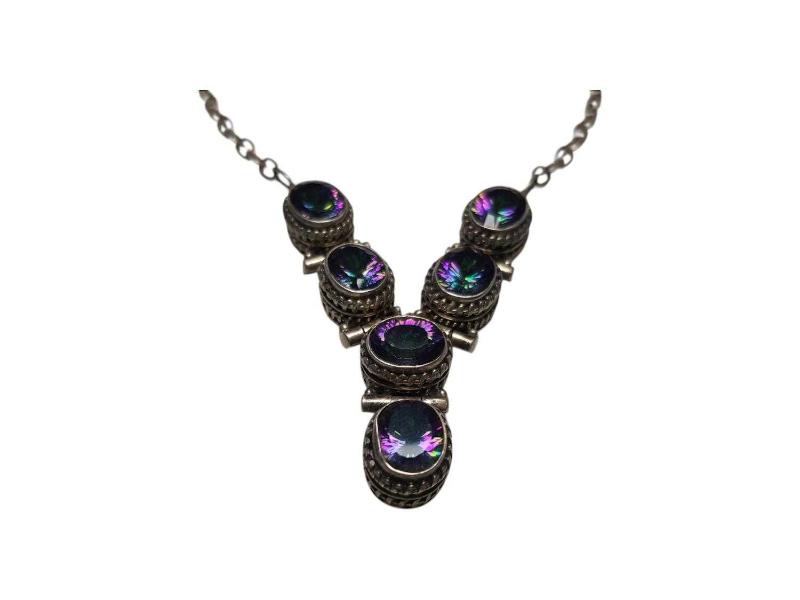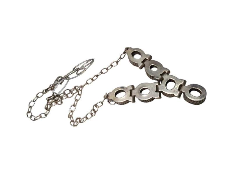 ÖZEL YAPIM MOZANİT TAŞLI GÜMÜŞ GERDANLIK başlıklı antika/koleksiyon objesi Türkiye menşe’lidir. 1940-1959 arası dönemine aittir.