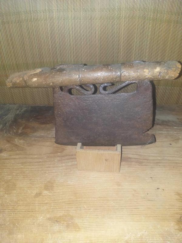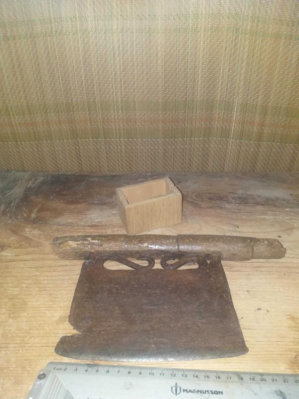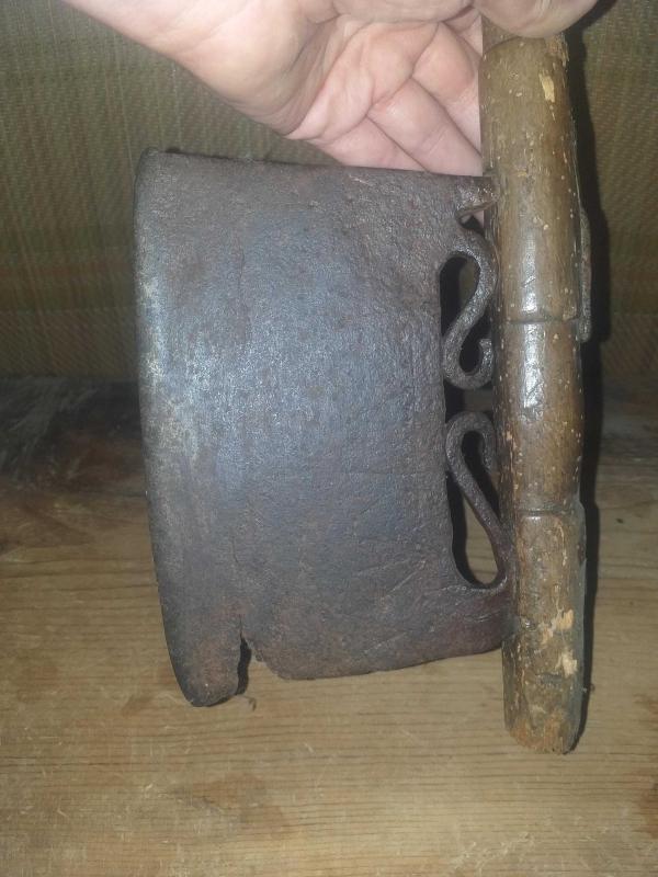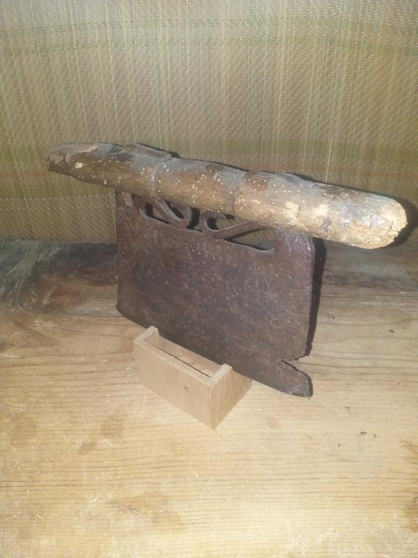 Dövme demir işçilikli , tekke işi derviş teberi , derviş baltası ,iki yüzü de yörük işi, oğuz boyunun simgesi üç ok motifleriyle süslü, ilginç tasarımı ve kesici kısmın sapa bağlantı detayındaki incelikle dikkat çeken, güzel bir masa süsü ,tarımda ormancılık işlerinde kullanılan alet , balta derviş teberi...teberlerde ortak bir sorun olan , sap kırılması yaşanmış ,tarafımdan icat ,minimalist teşhir standı ile birlikte gönderilecektir... Üçoklar, Türk mitolojisinde "yersel boylar" ı (arzi kavimleri) ifade etmek için kullanılan bir kavramdır. Bunlar, Oğuz Han'ın ilk (yerden çıkan) eşinden olan üç oğlu ve onlardan türeyen boylardır. Bunlar da Oğuz Boylarının 12'sini oluştururlar . Tarım ve savaş aleti , ethnografik sanat , ethnografic art , folk art...