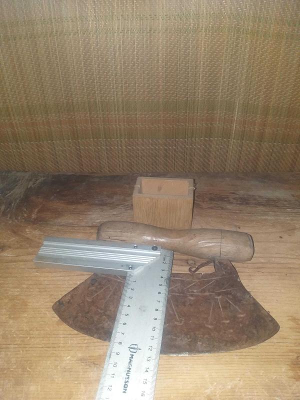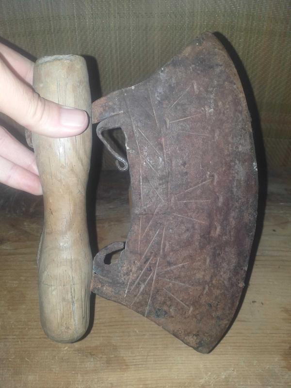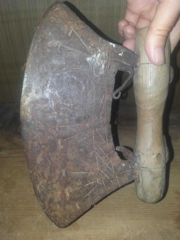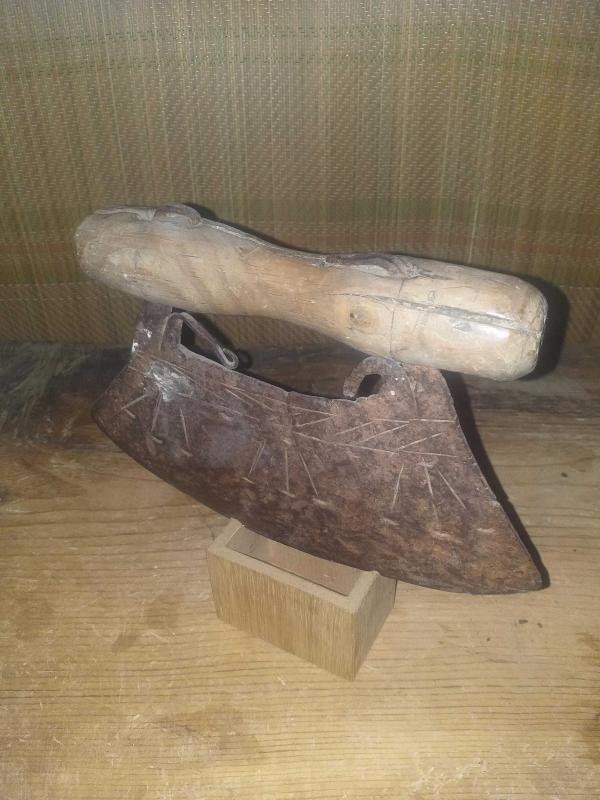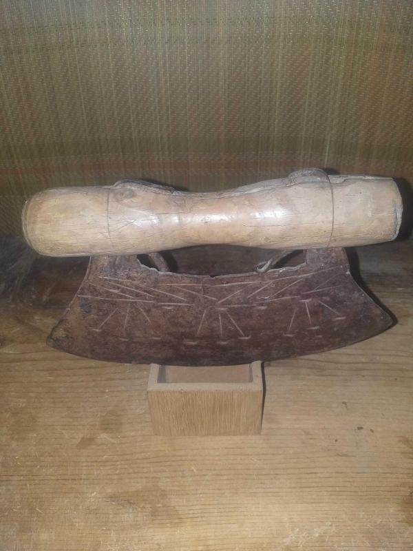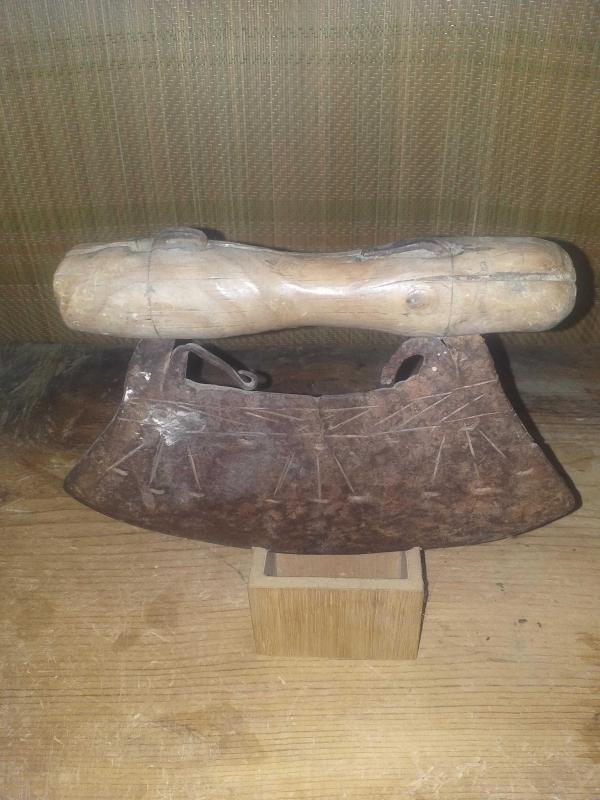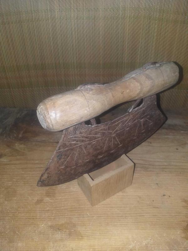 Dövme demir işçilikli , tekke işi derviş teberi , derviş baltası ,iki yüzü de yörük işi, oğuz boyunun simgesi üç ok motifleriyle süslü, ilginç tasarımı ve kesici kısmın sapa bağlantı detayındaki incelikle dikkat çeken, güzel bir masa süsü ,tarımda ormancılık işlerinde kullanılan alet , balta derviş teberi...teberlerde ortak bir sorun olan , sap kırılması yaşanmış ,tarafımdan icat ,minimalist teşhir standı ile birlikte gönderilecektir... Üçoklar, Türk mitolojisinde "yersel boylar" ı (arzi kavimleri) ifade etmek için kullanılan bir kavramdır. Bunlar, Oğuz Han'ın ilk (yerden çıkan) eşinden olan üç oğlu ve onlardan türeyen boylardır. Bunlar da Oğuz Boylarının 12'sini oluştururlar . Tarım ve savaş aleti , ethnografik sanat , ethnografic art , folk art...
