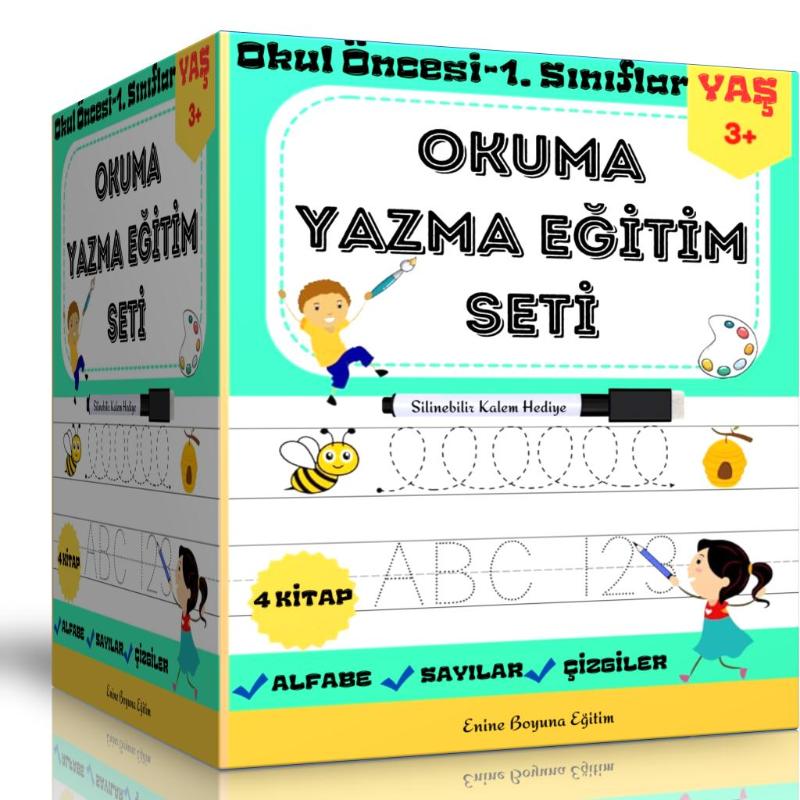 Okuma Yazma Eğitim Seti (YAZ-SİL) Okul Öncesi ve Birinci Sınıflar İçin 4 Kitaptan Oluşmaktadır. Okuma Yazma Eğitim Seti (YAZ-SİL) Sil, Yaz, Tekrar Öğren! Okuma yazmaya yeni başlayan çocuklar için özel olarak hazırlanan bu YAZ-SİL Eğitim Seti, harfleri tanımayı, hecelemeyi, kelime ve cümle yazmayı adım adım öğretir. Silinebilen sayfalar sayesinde çocuklar yanlış yapmaktan korkmadan özgürce pratik yapar, tekrar tekrar çalışarak kalıcı öğrenme sağlar. Set İçeriği: Harf Yazma Çalışmaları Hece ve Kelime Yazma Etkinlikleri Basit Cümlelerle Okuma Alıştırmaları Noktalı Yazı Şablonlarıyla El Yazısına Geçiş Renkli, eğlenceli ve dikkat çekici tasarımlar Silinebilen sayfalar ve kalem uyumu Kazandırdığı Beceriler: – Harfleri tanıma ve doğru yazma – Ses-hece-kelime-cümle bütünlüğünü kavrama – Dikkat, el-göz koordinasyonu ve motor beceriler – Özgüvenli okuma ve yazma alışkanlığı Sil – Yaz – Tekrar Et! Her çocuk kendi hızında öğrenir, tekrar ederek pekiştirir. İlkokul öncesi hazırlık ve 1. sınıf öğrencileri için mükemmel başlangıç seti! Okumayı ve yazmayı eğlenerek öğretmek artık çok kolay! 3 Adet Yaz Sil Kitabı ve 1 Adet Alfabe Etkinlikleri Kitabı Yaz-Sil Laminasyonlu Alfabe ve Okuma Yazma Öğretimi Yaz-Sil Laminasyonlu Sayılar-Rakamların Öğretilmesi Yaz-Sil Laminasyonlu Çizgi ve Desenlerle Kalem Kontrolü Sağlayacaksınız Okul Öncesi Çocukları Okula Hazır Hale Getirecek Eğitim Setimiz Okula devam eden çocuklar için farkındalık yaratacak ve çocuğu farklı kılacaktır. Sistemli Öğretim sağlayan eğitim setimiz 125 micron laminasyonla kaplıdır ve 120 gramajlı kağıda dijital renkli baskı yapılmıştır. Eğitim setimiz kolay kullanım sağlamak için spiralli olarak hazırlanmıştır. Okuma Yazma Eğitim Seti (YAZ-SİL) İçeriği: YAZ-SİL Okuma Yazma Kitabı Yaz-Sil Sayılar Öğreten Kitap Yaz-Sil Kalem Kontrolü Sağlayan Çizgi ve Desenler Kitabı Spiralli Baskılı Alfabe Etkinlikleri Kitabı Okuma Yazma Eğitim Seti (YAZ-SİL) Hediyeleri: 1 Adet Silinebilir Kalem Hediye 1 Adet Uçlu Kalem Hediye Okuma Yazma Eğitim Setinin Faydaları: Kalem Kontrolünü Sağlar Çocuk Okula Hazır Hale Getirilir. Okula devam edenler için akranlarından farklı olur. Laminasyonla kaplıdır ve daha dayanıklıdır. Birkaç çocuk aynı anda kullanabilir. Okuma Yazmayı ve Sayıları Sistemli Öğretmektedir Cilt Özellikleri : Sarff 450Mic. A4 Şeffaf Kapak (Sert Kapak) Şeffaf kapağın altında kitabın renkli kapağı yer almaktadır. Sert Kapak (Dış Kapak) Özellikleri: 450 Micron Buzlu Şeffaf Kapak (Sert Kapak) Kraft Cilt (Arka Kapak) Özellikleri: Kraft Kağıt ham maddesi odun selülozudür. Suya dayanıklıdır. Kopma mukavemetlidir. Neme dayanıklıdır. Helezon Özellikleri: Sarff 14 mm Pvc Helezon Spiral Şeffaf (4:1) flament çapı 1,8 dır. Okuma-Yazma YAZ-SİL Kitabı İçeriği: 3 adet yaz sil kitabı 1 adet alfabe etkinlik kitabı 1 adet silinebilir kalem 1 adet uçlu kalem Okuma-Yazma YAZ-SİL Kitabı İçeriği: Kitap Boyutu: 29x21 cm Okuma-Yazma YAZ-SİL Kitabı Sayfa Sayısı : 124 Laminasyon Özellikleri: Malzeme : 100-125 Mic. Boyut : 216x303mm (A4)