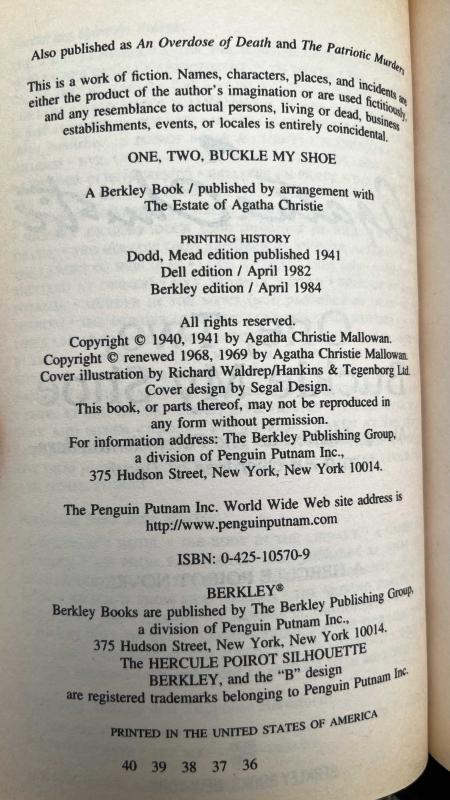 One, Two, Buckle My Shoe: A Hercule Poirot Novel (Also publised as The Patriotic Murders and An Overdose of Death) - English - Softcover - Agatha Christie - Berkley Books adlı eser, Kitap > Edebiyat, Kurgu > Polisiye, Cinai > Dünya Edebiyatı > Agatha Christie kategorisinde İkinci El olarak satıştadır.