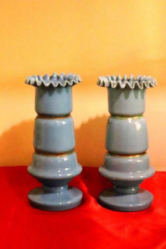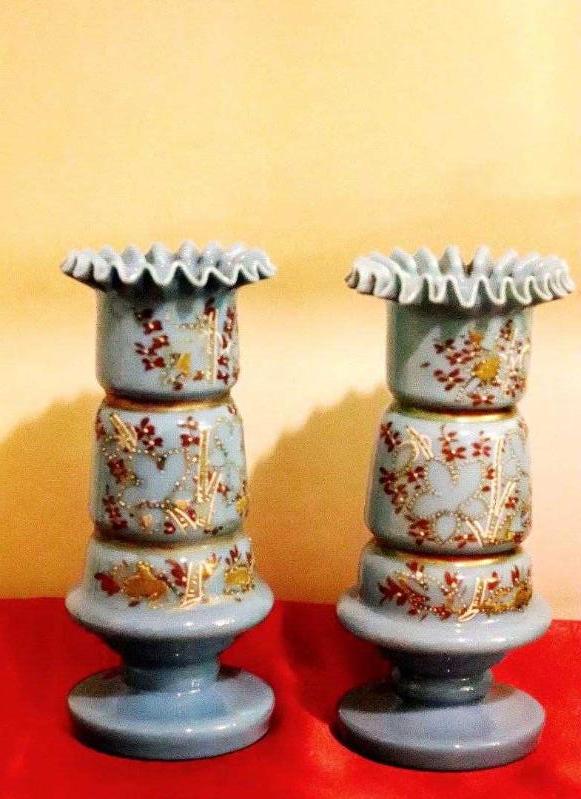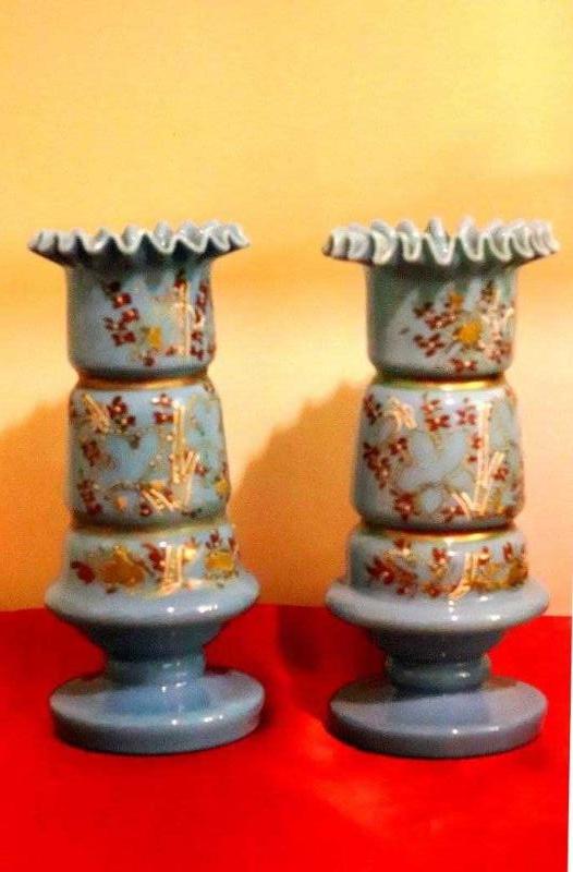 Opalin, yüzeyi el boyaması figüratif çiçek desenli, altın yaldızlı, eski dönem çift vazo.. Y 26cm., 3 yıl önce kitantik’te satışa sunulmuştur.