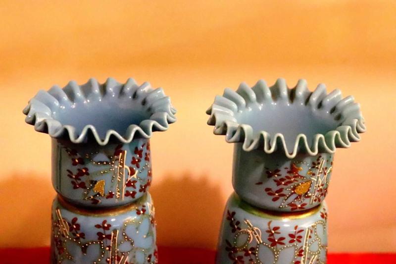 Opalin, yüzeyi el boyaması figüratif çiçek desenli, altın yaldızlı, eski dönem çift vazo.. Y 26cm. başlıklı antika/koleksiyon objesinin menşei belirtilmemiştir. 1900-1949 arası dönemine aittir.