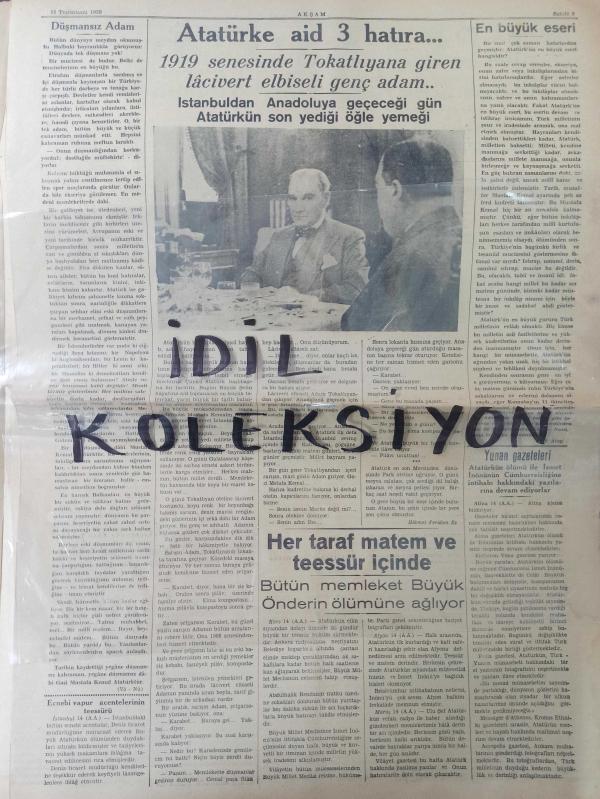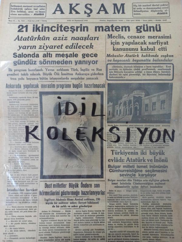 Akşam Gazetesi - Newspaper - 15 Teşrinisani 1938 - 15 Kasım 1938 - 15 November 1938 - Atatürk'ün aziz naaşları yarın ziyaret edilecek - Türkiye'nin iki büyük evladı: Atatürk ve İnönü - Atatürk Sovyetlerle sıkı münasebetler idamesi lehinde bulunmuştur - Atatürk, Türkiye'yi kılıcı ile meydana getirmiş ve dehası ile tensik etmiştir - Almanya Atatürk'ün eserine mücadelesine hayran - Meclis, cenaze merasimi için yapılacak sarfiyat kanununu ittifakla kabul etti - Mağlup olmaz kumandan Mustafa Kemal - Atatürk'e ait 3 hatıra - Kurucusunu kaybeden boynu bükük Ankara - Atatürk anıtı - Atatürk'ün son sözü: Saat kaç diyen sormaktan ibaret oldu - İktisadi ve Mali hafta - Parker kalem reklamı - Asipin Kenan ilaç reklamı - Telefunken radyo reklamı - Neokalmina ilaç reklamı - Zamana bağlı olarak sararma, yıpranma ve yırtılmalar görülmektedir. Gazetenin Ön ve Arka Sayfaları Asetat kaplamadır. Gazetenin devamı poşet içindedir. Asetat kaplamanın üzerindeki delikleri çerçeve için kullanabilirsiniz -