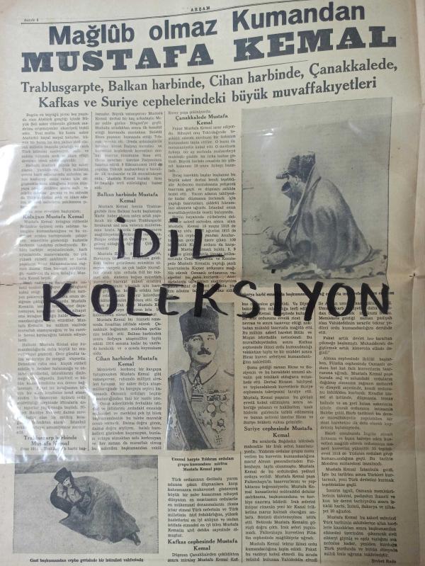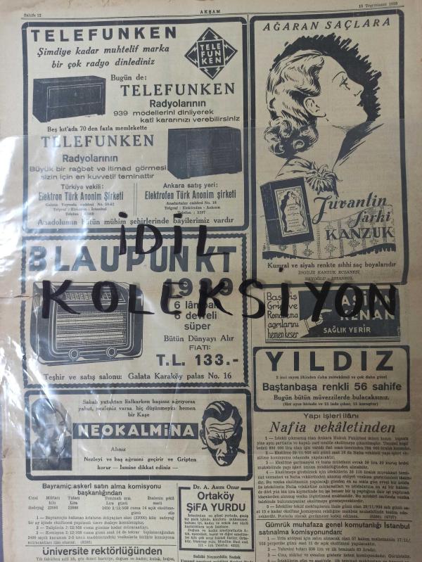 Orijinal Akşam Gazetesi - Newspaper - 15 Teşrinisani 1938 - 15 Kasım 1938 - 15 November 1938 - Atatürk'ün aziz naaşları yarın ziyaret edilecek - Türkiye'nin iki büyük evladı: Atatürk ve İnönü - Atatürk Sovyetlerle sıkı münasebetler idamesi lehinde bulunmuştur - Atatürk, Türkiye'yi kılıcı ile meydana getirmiş ve dehası ile tensik etmiştir - Almanya Atatürk'ün eserine mücadelesine hayran - Meclis, cenaze merasimi için yapılacak sarfiyat kanununu ittifakla kabul etti - Mağlup olmaz kumandan Mustafa Kemal - Atatürk'e ait 3 hatıra - Kurucusunu kaybeden boynu bükük Ankara - Atatürk anıtı - Atatürk'ün son sözü: Saat kaç diyen sormaktan ibaret oldu - İktisadi ve Mali hafta - Parker kalem reklamı - Asipin Kenan ilaç reklamı - Telefunken radyo reklamı - Neokalmina ilaç reklamı - adlı eser, Kitap > Tarih > Atatürk kategorisinde İkinci El olarak satıştadır.
