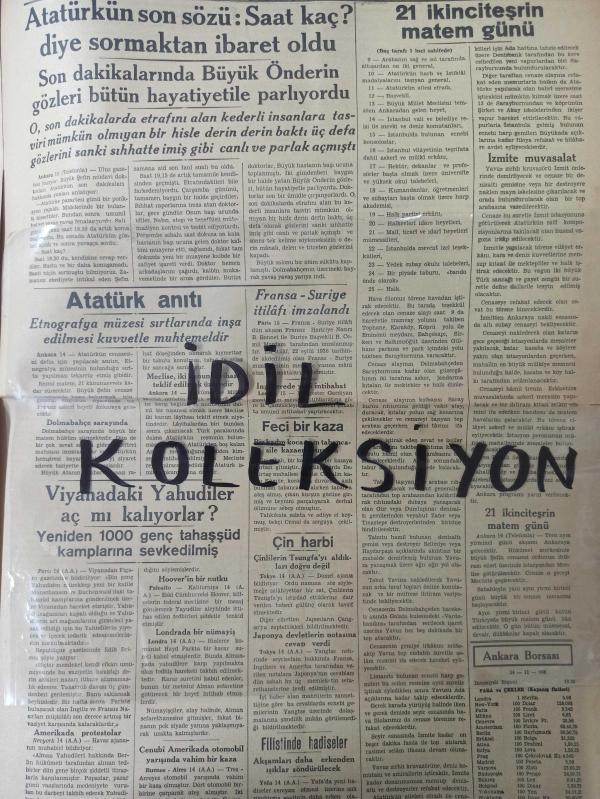 Orijinal Akşam Gazetesi - Newspaper - 15 Teşrinisani 1938 - 15 Kasım 1938 - 15 November 1938 - Atatürk'ün aziz naaşları yarın ziyaret edilecek - Türkiye'nin iki büyük evladı: Atatürk ve İnönü - Atatürk Sovyetlerle sıkı münasebetler idamesi lehinde bulunmuştur - Atatürk, Türkiye'yi kılıcı ile meydana getirmiş ve dehası ile tensik etmiştir - Almanya Atatürk'ün eserine mücadelesine hayran - Meclis, cenaze merasimi için yapılacak sarfiyat kanununu ittifakla kabul etti - Mağlup olmaz kumandan Mustafa Kemal - Atatürk'e ait 3 hatıra - Kurucusunu kaybeden boynu bükük Ankara - Atatürk anıtı - Atatürk'ün son sözü: Saat kaç diyen sormaktan ibaret oldu - İktisadi ve Mali hafta - Parker kalem reklamı - Asipin Kenan ilaç reklamı - Telefunken radyo reklamı - Neokalmina ilaç reklamı - adlı eser Türkçe dilindedir.