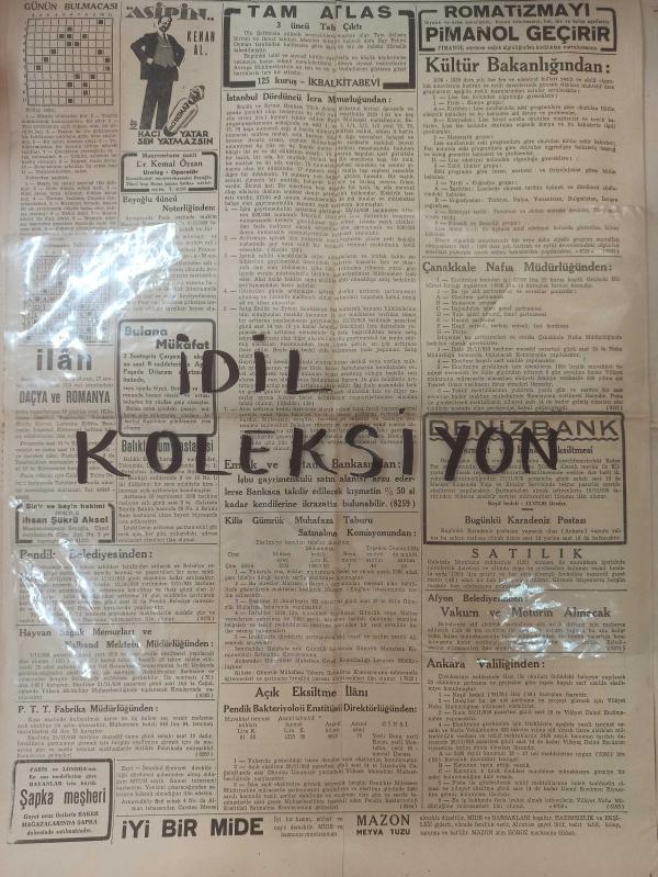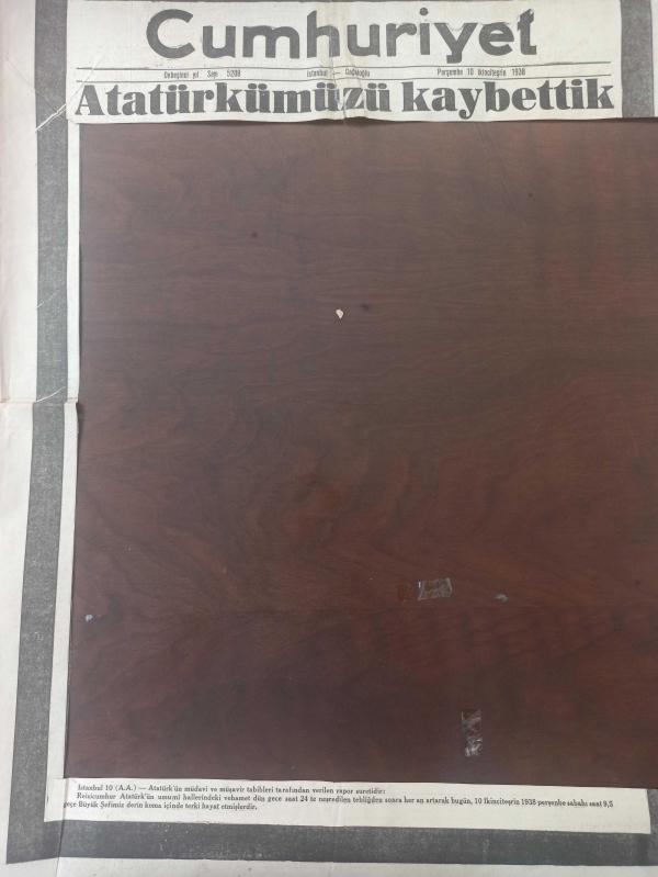 Orijinal Cumhuriyet Gazetesi - Newspaper - 10 İkinciteşrin 1938 - 10 Kasım 1938 - 10 November 1938 - Atatürkümüzü kaybettik - Resmi tebliğ - Dünyanın en muazzam tayyare defi topu - Harry Baur - Radyolin diş macunu reklamı - Hadiselerin resimleri - Ay tutulması ve Kristof Kolomb - Meşhur kaşif, husuftan nasıl istifade etmişti - Pimanol ilaç reklamı - Cafer müshil şekeri ilaç reklamı - Aspirin ilaç reklamı - Gripin reklamı - Amerikan İmparatorluğu - Cehalet faciası - Amerika'da seçim - Dublin'deki grev gittikçe büyüyor - Paris'te Leh Yahudisinin vurduğu Alman sefaret katibi öldü - Kapatılan barsak imalathaneleri - Zamana bağlı olarak sararma, yıpranma ve yırtılmalar görülmektedir. İlk sayfadaki Atatürk fotoğrafı eksiktir, kesilmiştir