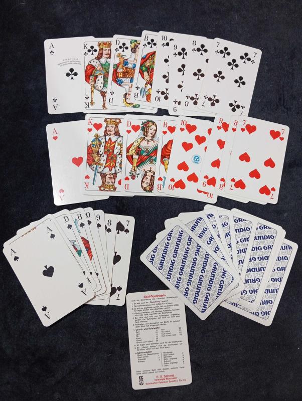 Orijinal Grundig marka Skat İskambil Destesi – 32 Kart Alman Skat oyunu için özel deste Standart 52’lik değil, Skat’a uygun 32 karttan oluşur. Marka: F.X. Schmid (Alman üretim) 7’den As’a kadar kartlar mevcut Skat kuralları kartı içinde Temiz ve düzgün durumda Eksiksiz 32 kart ve oyun kuralları karti Skat oynayanlar ya da koleksiyon yapanlar için güzel bir parça. Alman üretimi olduğu için klasik destelerden biraz daha özel, en son bir ay önce güncellenmiştir.