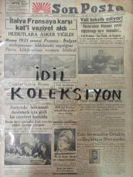 Orijinal Son Posta Gazetesi - Newspaper - 23 Birincikanun 1938 - 23 Ekim 1938 - 23 October 1938 - İtalya Fransa'ya karşı kati vaziyet aldı - Suriye'de hükümeti devirmek için gizli bir cemiyet kuruldu - İngiltere'nin müdafaası - Yugoslavya ile Macaristan bir blok teşkil edeceklermiş - Karabük'te ilk fabrika Mart'ta işlemeye başlıyacak - Okmeydanı cinayeti yeni bir safhaya girdi - Kayseri Halk evinin temeli atıldı - Yeniden bir posta havale memurunun ihtilası meydana çıkarıldı - Cemil Topuzlu - Atatürk'ün Hatıratı - Vediken Vakası - Katrin Hepburn - Neokürin ilaç reklamı - Denizaltıların büyük harbte gösterdikleri en büyük muvaffakiyet - Gripin ilaç reklamı - Ankara radyosu - İzmitte grup birincilik maçları sona erdi - Gripin ilaç reklamı - Pektorin ilaç reklamı - Kanzuk ilaç reklamı - Zamana bağlı olarak yırtılmalar, sararmalar, yıpranmalar görülmektedir. Gazetenin yırtık kısımları bantlanmiştır Gazete ciltten çıkmadır