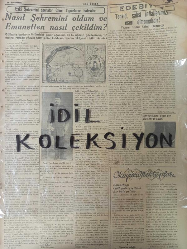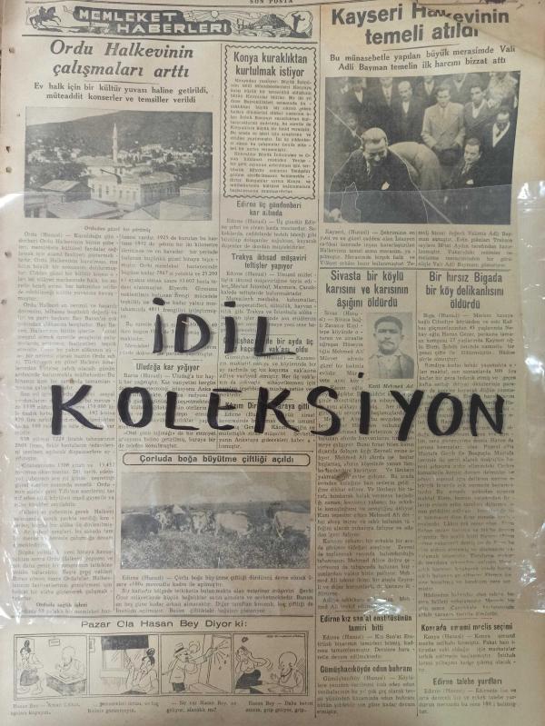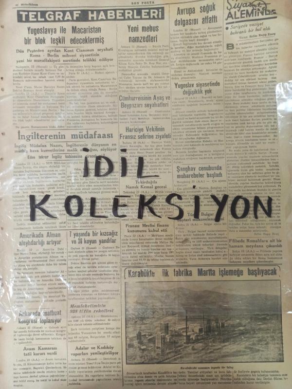 Orijinal Son Posta Gazetesi - Newspaper - 23 Birincikanun 1938 - 23 Ekim 1938 - 23 October 1938 - İtalya Fransa'ya karşı kati vaziyet aldı - Suriye'de hükümeti devirmek için gizli bir cemiyet kuruldu - İngiltere'nin müdafaası - Yugoslavya ile Macaristan bir blok teşkil edeceklermiş - Karabük'te ilk fabrika Mart'ta işlemeye başlıyacak - Okmeydanı cinayeti yeni bir safhaya girdi - Kayseri Halk evinin temeli atıldı - Yeniden bir posta havale memurunun ihtilası meydana çıkarıldı - Cemil Topuzlu - Atatürk'ün Hatıratı - Vediken Vakası - Katrin Hepburn - Neokürin ilaç reklamı - Denizaltıların büyük harbte gösterdikleri en büyük muvaffakiyet - Gripin ilaç reklamı - Ankara radyosu - İzmitte grup birincilik maçları sona erdi - Gripin ilaç reklamı - Pektorin ilaç reklamı - Kanzuk ilaç reklamı - adlı eser Türkçe dilindedir.