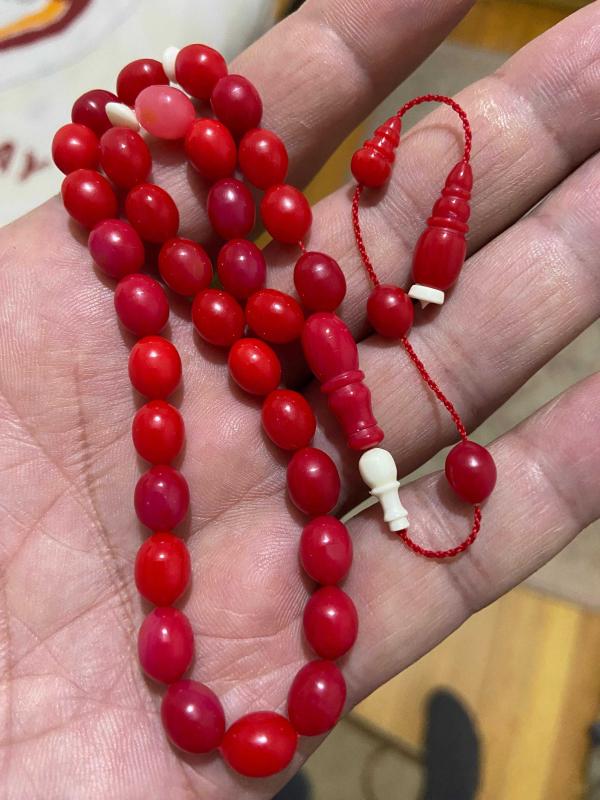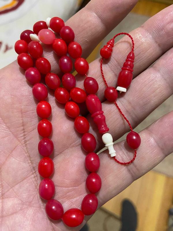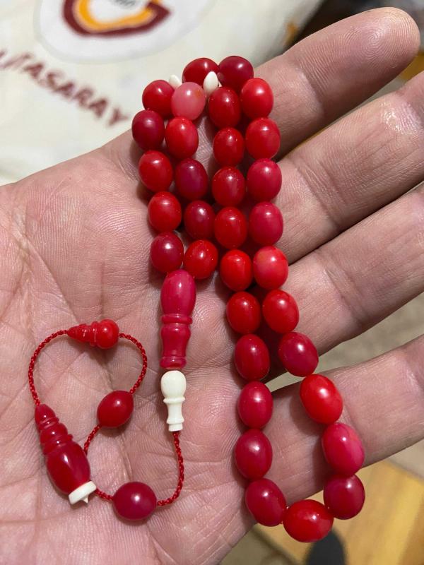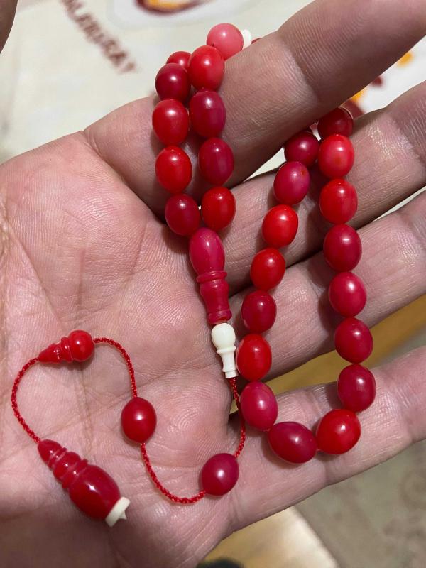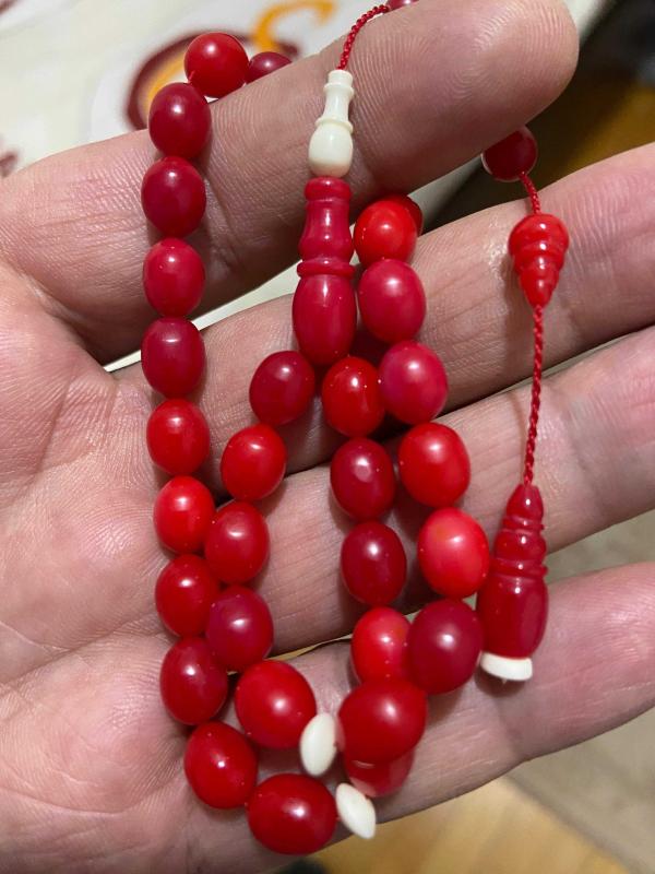 Osmanlı Miskevi (mercan) bağa tespih habbeden 6.8*8,7 mm habbeden Osmanlı mercan bağa tespih çok güzel görsele sahip işçilik bana aittir. 12.35 gram 06 mm ip yolu Seneler geçtikçe değerlenecek ürün Orjinal eski malzemeden.