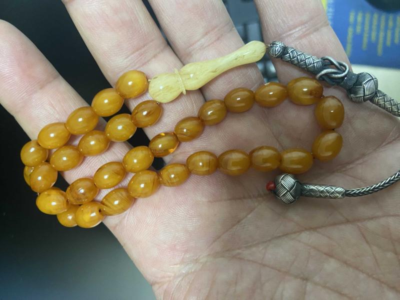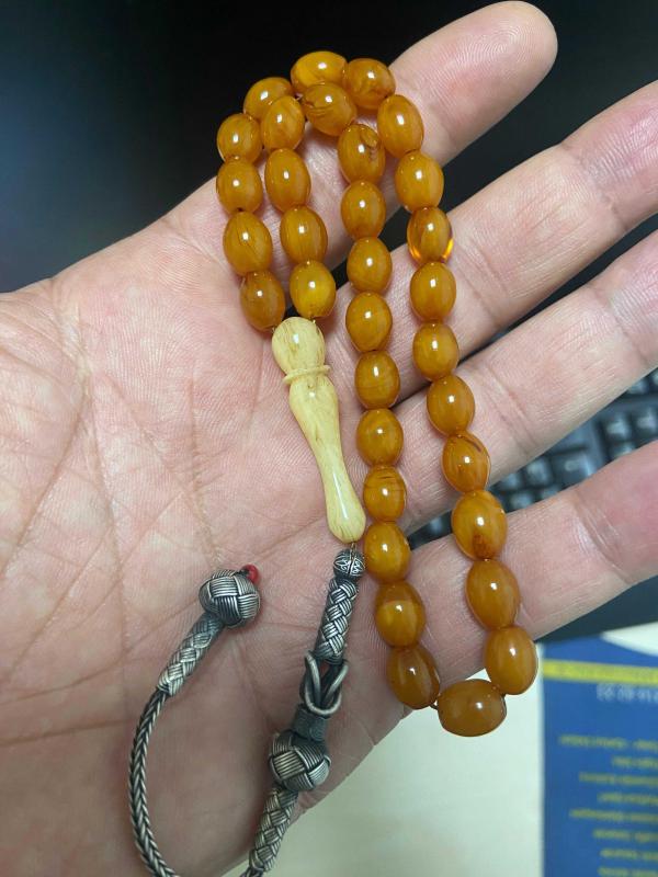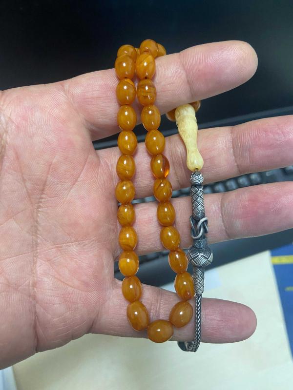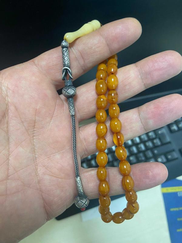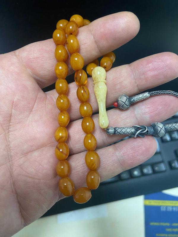 Açıklamayı iyi okuyalım lütfen Orijinal objeden 99 luk tespihten bozmadır. Osmanlı sıkma kehribar tespih işçiliği eski yapım olup renk almış. 7*9.3mm 13 gram civarı olup helezon harelidir. İmame işçiliği volkan acara ait objeden yapım Püskül 1000 ayar kazaz gümüştür.