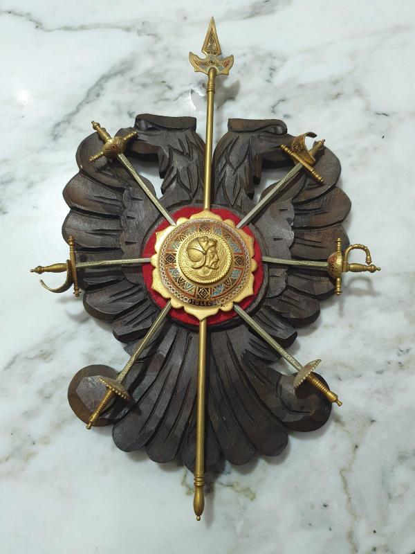 Orjinal Toledo Ispanya- Eksiksiz Antika duvar Plaketi (Çift basli kartal & minyatur kiliclar başlıklı antika/koleksiyon objesi Avrupa menşe’lidir. 1840-1859 arası dönemine aittir.