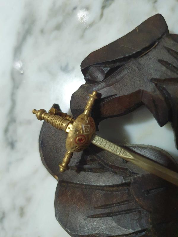 Donem: 1950 &60 lar (Vintage) Mensei: Toledo İspanya Malzeme: Masif ahsap kaide , pirinc ve mine islemeli metal kiliclar. Kiliclarin namlu kisminda toledo damgasi okunmaktadir, kiliclar yerinden cikmaktadir. Kiliclar 9cm. Kaide toplam boy:18cm en: 15cm Mizrak 25cm