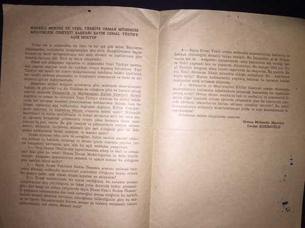 Orman Mühendisi Cevdet Kozinoğlu Kocaeli Mebusu Cemal Tüzün'e Açık Mektup 1950'ler, en son 1 yıl önce güncellenmiştir.