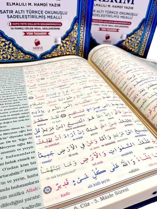 Merve Yayınları Orta Boy Satır Altı Türkçe Okunuşlu ve Türkçe Mealli Kuran-ı Kerim Her İnsan Kuran Okumayı Öğrenebilir... Günümüz teknolojisi bu konu da insanların hizmetine birçok ürünler sunmaktadır. İnteraktif CD’ler, İnternet, Kasetler, Elif-ba kitapçıkları gibi çok çeşitli imkanlar vardır. Herşeye Rağmen Kuran-ı Arapçasından okuyamayanlar için hazırlanmış olan bu eserde, aynı sayfa içinde hem Arapça metin, hem Türkçe okunuş, hem de meal içeriğiyle yanlışsız ve anlaşılır olarak okunmasını sağlamaktadır. Ürün Özellikleri: Ebat 17 x 24cm'dir. Sayfa sayısı 624'dür. 1. Kalite Şamua kağıttır. Lüks Ciltli Sert kapaktır. Hafız Fatih Çollak'ın Seslendirmesiyle, 10 Farklı Dilde Meal Dinleyebilirsiniz. Sadeleştirilmiş Meallidir. Arapça bilmeyenler daha az hata ile okuyabilir. Elmalılı Muhammed Hamdi Yazır Meallidir.. Arapça yazılı ve Türkçe meallidir. Ayetler renkli olarak ayrılmış ve kelimelerin Türkçe okunuşu yazılmıştır. BİLGİSAYAR HATLIDIR KOLAYCA OKUNUR.