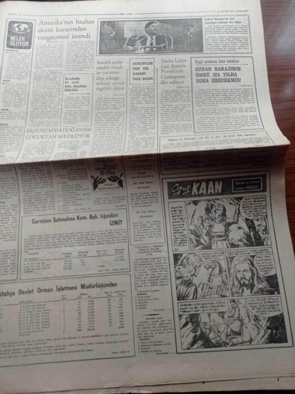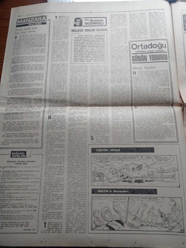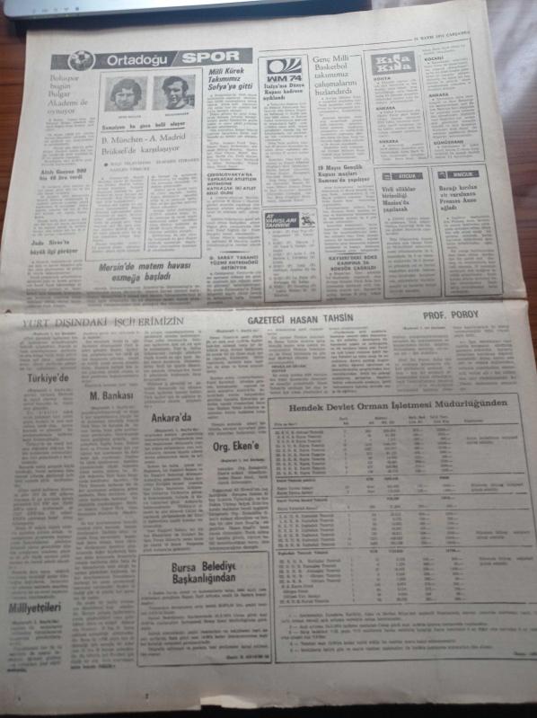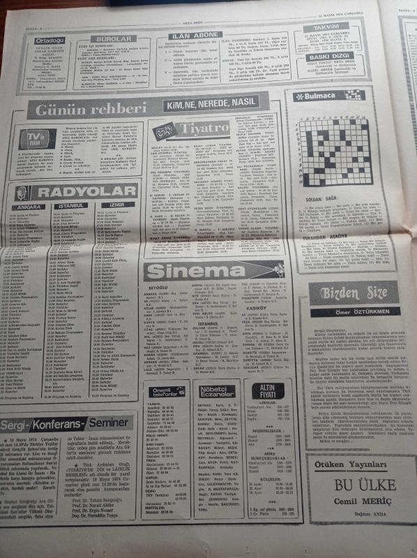 Ortadoğu Gazetesi - 15 Mayıs 1974 - İrfan Atagün - Şampiyon Kulüpler Kupası Finali Bayern Münih Atletico Madrid - İtalya'nın Dünya Kupası Kadrosu Açıklandı - Gümrük Ve Tekel Bakanı Mahmut Türkmenoğlu - Zeynep Kamil Hastanesi Yardımlaşma Derneği Yüzüğü - Evliya Çelebi Seyahatnamesi - Alev Arık - Necmettin Hacıeminoğlu - Ahmet Guner- Amerika'nın Haşhaş Ekimi Kararından Vazgeçmesi İstendi - Genel Af Kanunu Kesinleşti En Kısa Zamanda Tahliyelere Başlanıyor - Reha Poroy - Uçaklara Sabotaj Hazırlayan 4 Türk Almanya'da Yakalandı - Halk Kurtuluş Ordusu Davası adlı eser Türkçe dilindedir.