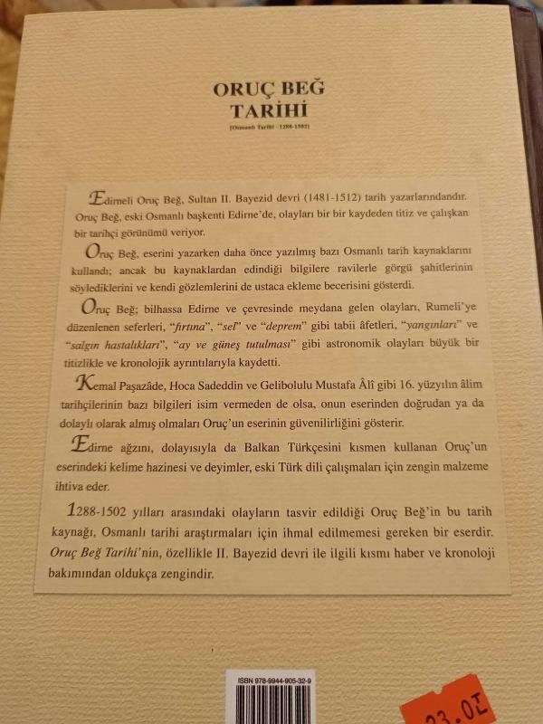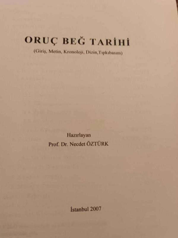 Oruç Beğ Tarihi; Osmanlı Tarihi (1288-1502) (Ciltli, Giriş, Çeviri Metin, Kronoloji, Dizin, Tıpkıbasım), Prof. Dr. Necdet Öztürk tarafından kaleme alınmıştır. Kitap 2007 yılında Çamlıca Basım Yayın tarafından [İstanbul] yayınlanmıştır. 503 sayfadır. Oruç Beğ Tarihi; Osmanlı Tarihi (1288-1502) (Ciltli, Giriş, Çeviri Metin, Kronoloji, Dizin, Tıpkıbasım) adlı eser Türkçe dilindedir. Eserin içeriğinde Osmanlıca dilinde bölümlere de yer verilmektedir.