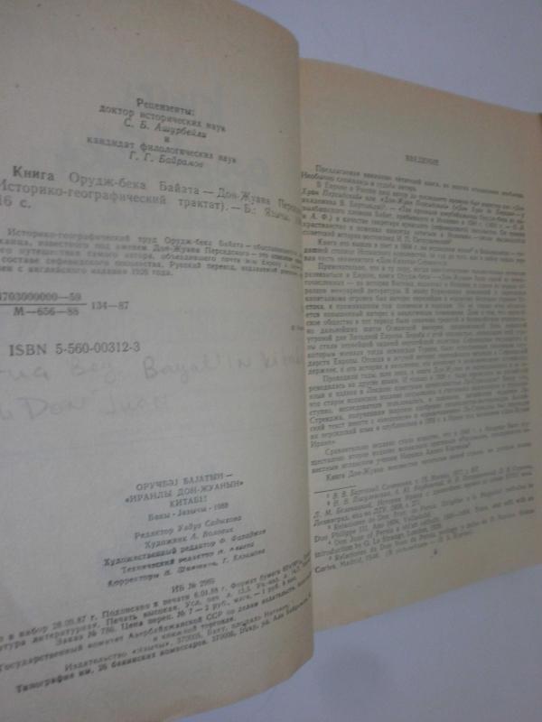 Eser садыхова editörlüğünde hazırlanmıştır. Kitap 1988 yılında Yazıçı tarafından [Bakü Баку] yayınlanmıştır. 216 sayfadır. Oruç Bey Bayat İranlı Don Juan ( Rusça dilinde) - книга Орудж-бека Байата - дон-Хуана Персиского (на русском языке) adlı eser Rusça dilindedir.