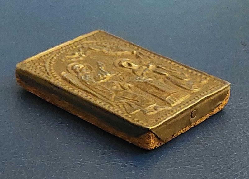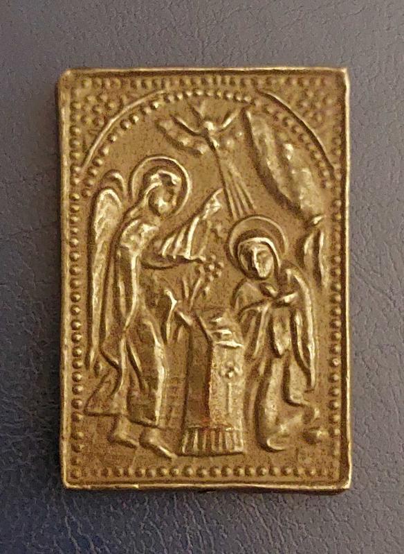 Osm. Dönemi, Orijinal Ortodoks Minyatür Rum İkona / Meryem Ana ve Melek Temalı. Kısaca: "Tanrının Melek Aracılığı İle Meryem Ana’ya İsa’nın Annesi Olacağını İlettiği Anın Tasviri." Mükemmel Kabartma Figürleri ile El Yapımı Rum İşi İkona. Ahşap Üzeri Metal Giydirmeli. 18 YY Ortaları. Orijinal-Nadir. (4×5,5 cm)