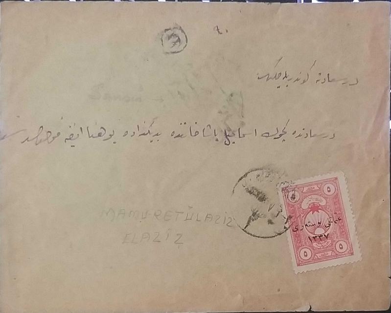 Osmanlı ZARF Elazığ'dan İstanbul'a gitmiş,Anadolu hükümeti 5k fiscal pullu iki lisanlı Mamuretul Aziz,Elaziz ve varış damgaları ile,Nadir.