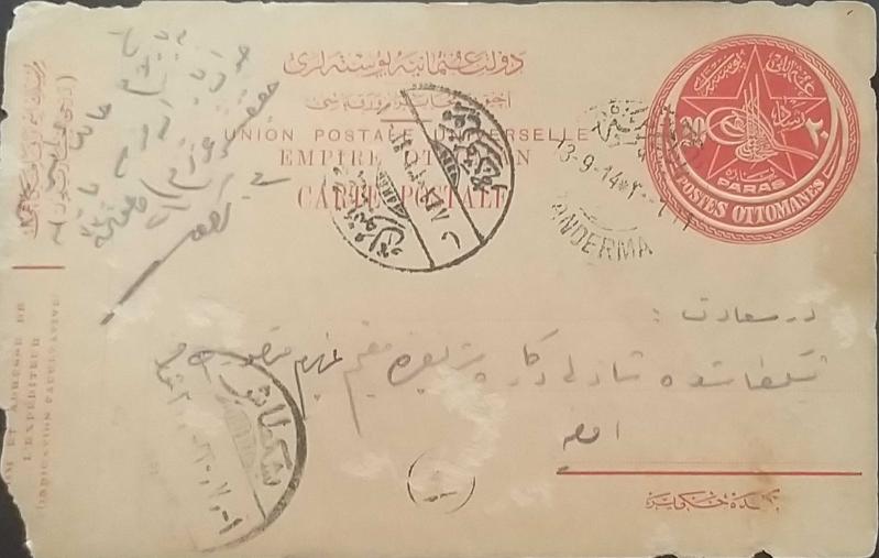 Osmanlı 1914 Bandırma iki lisan damgalı 20p Posta Kartı arkada osmanlıca yazısı ile,Nadir.