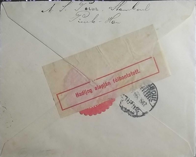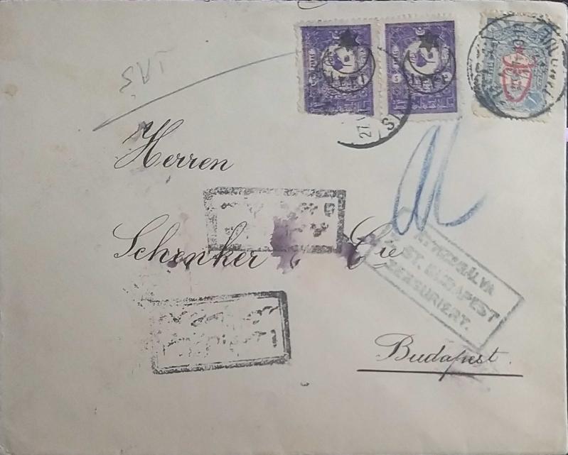 Osmanlı 1917 ZARF İstanbul'dan Budapeşte'ye Macaristan'a yollanmış Sürsarjlı pullarla ve iki lisanlı damgalı ve kapama etiketli ,Sansürlü ,Nadir.