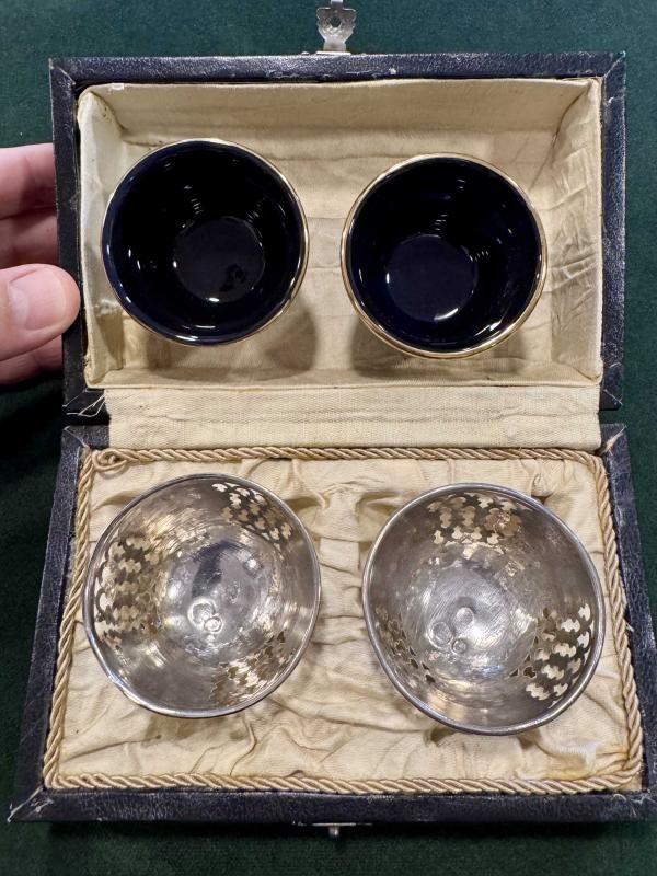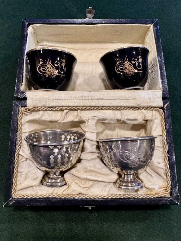 - Orijinal Osmanlı İkili Gümüş Fincan Zarfı - Tuğralı ve Sah damgalı - Kendi kutusunda - Osmanlı motifli - Kondisyon ve kozmetikiği gayet güzel - Fincanlar porselen ve yakın dönemdir