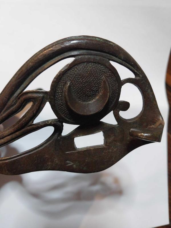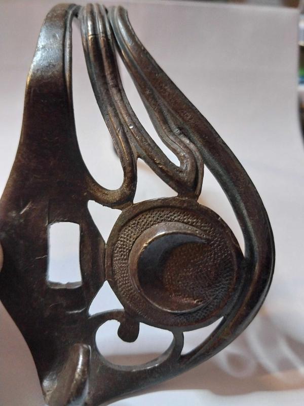 Osmanlı Kılıç Balçağı Osmanlı dönemi, bronz döküm malzemeden mamul, Osmanlı Süvari Birliği asker ve subaylarının kılıçlarında kullanılan hilal armalı kılıç balçağı. Uzunluk:22 cm