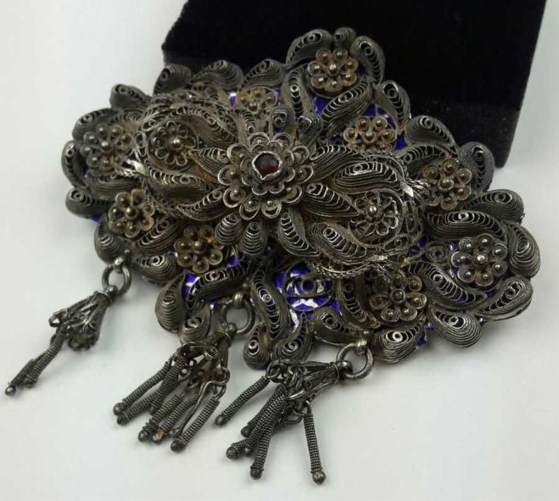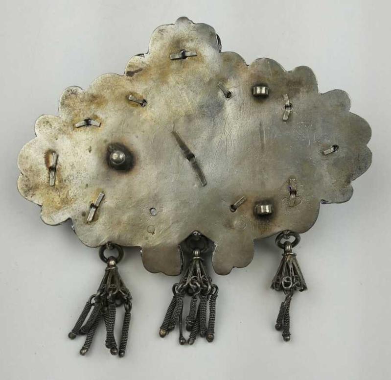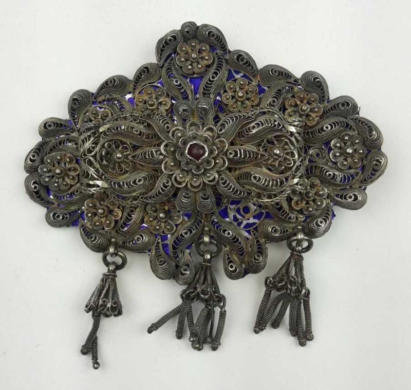 Osmanlı dönemi, 800 ayar gümüş üzerine Mineli telkari işçilikli, büyük boy sallamalı kemer tokası. Göbeğinde ateş kehribarı bulunmaktadır. Ermeni usta yapımıdır. Not: Bu boyutta nadir bulunmaktadır.