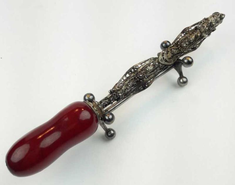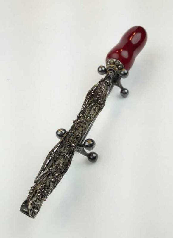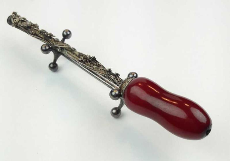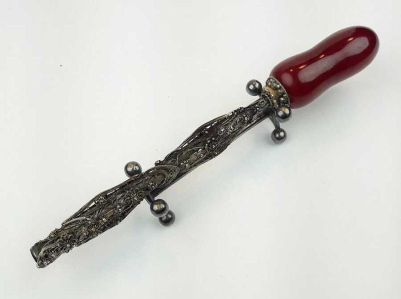 Osmanlı dönemi 800 ayar gümüş üzeri telkari işçilikli, Ermeni usta yapımı, çiçek motifli, baş tarafı dev boyda hareli sıkma kehribar. Not: Çok nadir bulunan bir üründür. Koleksiyonluktur.