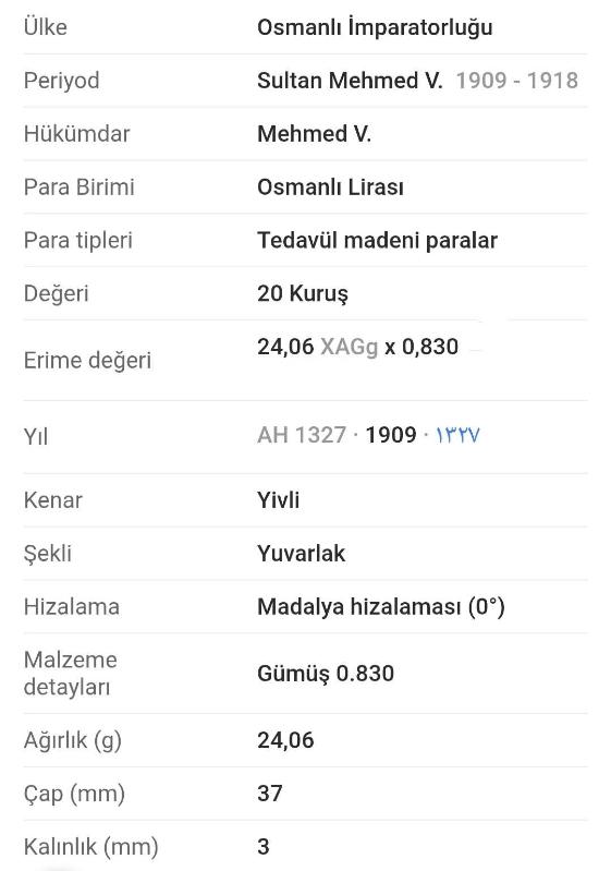 Osmanlı Son Dönem Sultan V.Mehmet Reşat Dönemi Gümüş 20 Kuruş ((1908)), en son 3 gün önce güncellenmiştir.