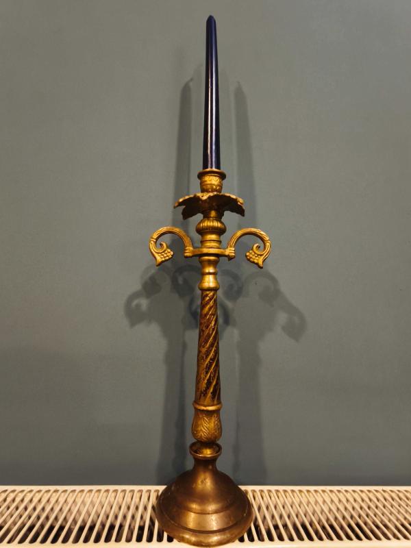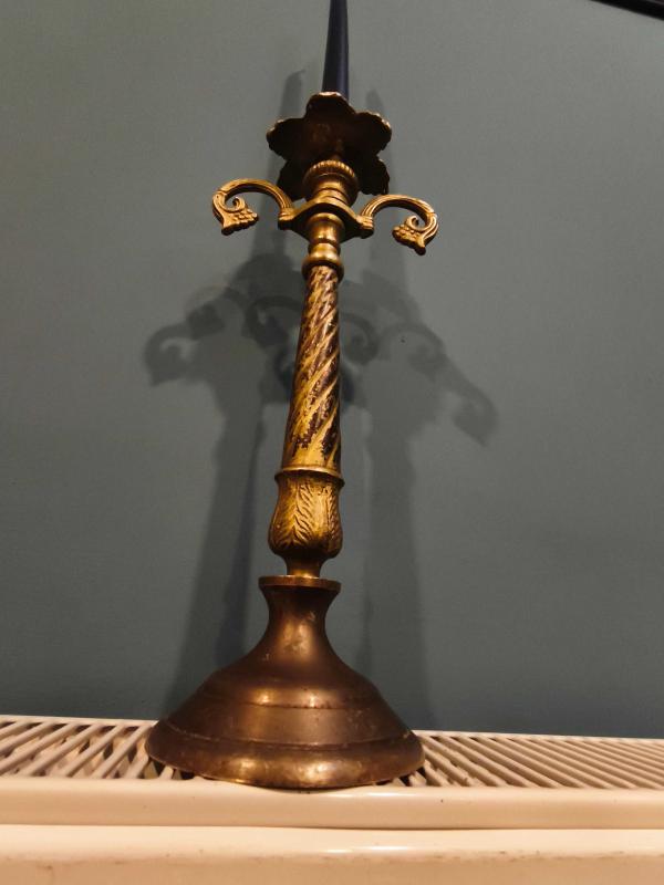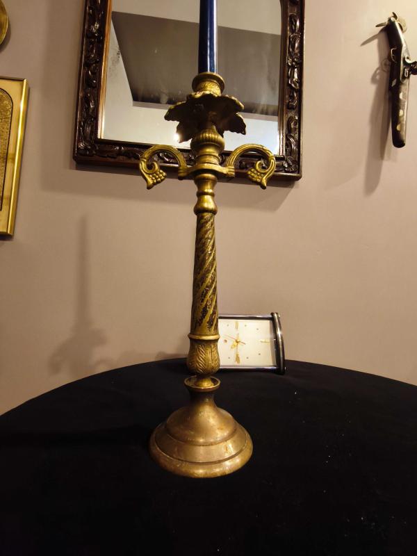 Bakır kaide üzeri bronz ( ağırdır ) şamdan. Çok iyi yaşlanmış bir görüntüye sahip ağır ve şık. Bedava rakama