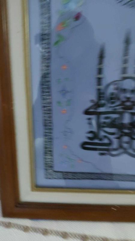 Osmanlı estetiğini yansıtan, cam altı tekniğiyle hazırlanmış özel bir hat sanatı tablodur. Merkezde yer alan cami tasvirli hat kompozisyonu, klasik İslami sanat anlayışını yansıtırken; çevresindeki el boyaması floral motifler esere zarif ve dengeli bir görünüm kazandırmaktadır. El işçiliğiyle hazırlanmış olup, dekoratif çerçevesiyle birlikte sunulmaktadır. Koleksiyonerler, klasik sanat tutkunları ve manevi değeri yüksek eser arayanlar için oldukça özel bir parçadır. 📌 Durum: Yaşına bağlı doğal izler mevcuttur (antikaya özgü) 📌 Teknik: Cam altı boyama – el işi 📌 Çerçeve: Orijinal, dönemsel görünümlü 📌 Adet: Tek ve benzeri yoktur Antika ruhunu yaşatacak, bulunduğu mekâna derinlik ve anlam katacak nadide bir eserdir.
