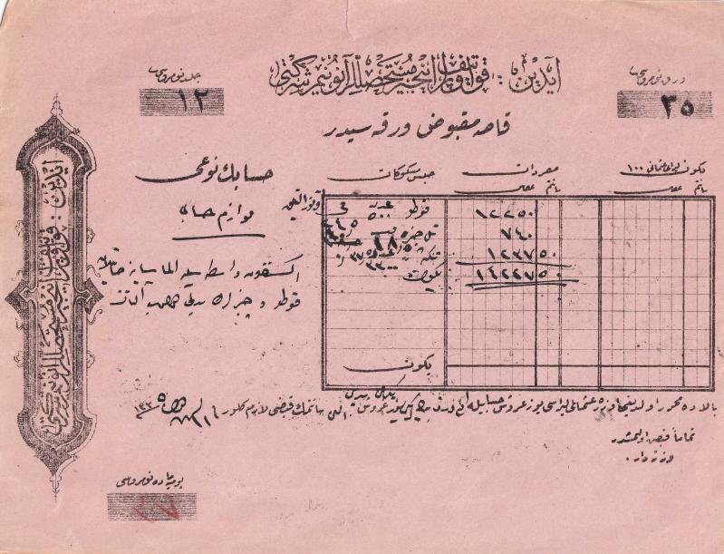 İlk Yerli Şirket - Aydın İncir Müstahsilleri Osmanlıca Aydın Kooperatif-i İncir Müstahsilleri Anonim Şirketi Kasa Makbuz Varakası, 1335 [1919] tarihlidir. Üzeri el yazısı ile doldurulmuştur. 20x15 cm. "Aydın Kooperatif İncir Müstahsilleri Anonim Şirketi" İkinci Meşrutiyet döneminin "Kooperasyon" ve "Milli İktisat" politikalarının bir ürünü olarak ortaya çıkmıştır. İttihat ve Terakki'nin Aydın Örgütü öncülüğünde kurulan şirket. ihraç ürünleri piyasasındaki koşullara bir tepki biçiminde, incir üreticilerini yabancı ve azınlık tüccara karşı korumak, onlar karşısındaki durumu güçlendirmek amacını taşıyordu. Birinci Dünya Şavaşı boyunca da faaliyetini sürdürdü. Ancak, savaş sonrası Osmanlı Devletinin imzalamış olduğu ateşkes hükümlerine dayanılarak, Türkiye'nin en verimli tarımsal alanlarının bulunduğu Batı Anadolu topraklarının Yunan işgaline uğraması kooperatifi de olumsuz yönde etkiledi. Kooperatif Yunan işgaliyle birlikte hayli zor günler yaşamış olmakla beraber, ilk işgal yılında elinde bulunan malları pek olumsuz koşullar altında tasfiye etmek zorunda kalmış ve 1919 yılı zararlarını 1918 yılı kârlarıyla kapatma yoluna gitmiştir.
