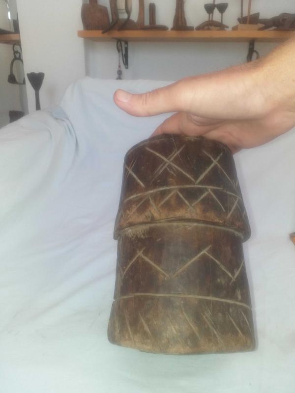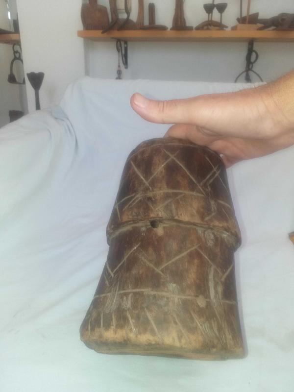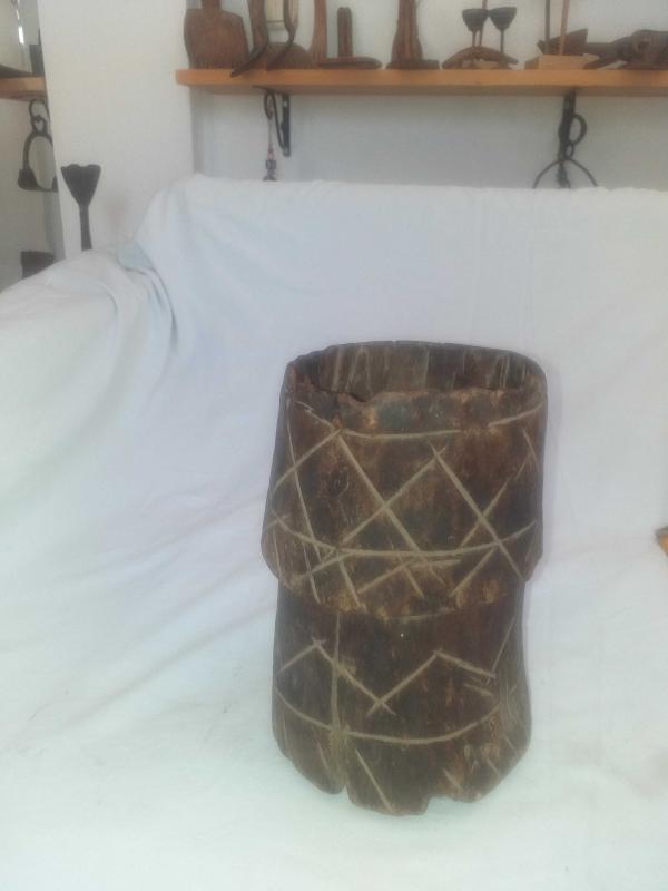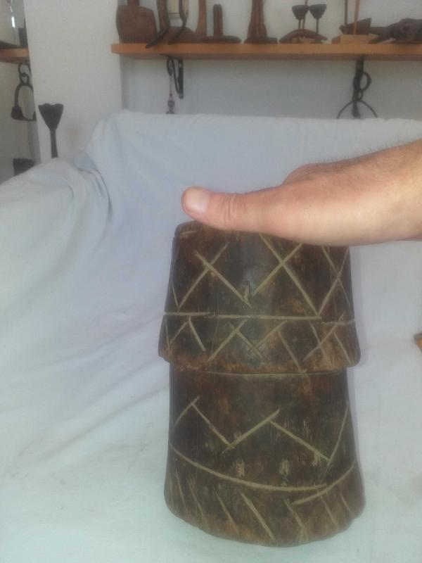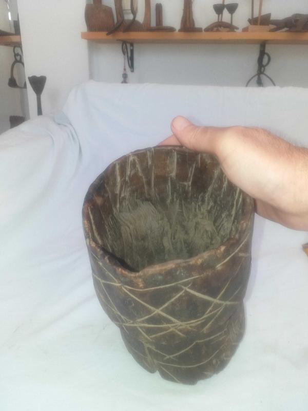 Yörük işi, muazzam patinesiyle güzel eskimiş ,ağacın içi keser benzeri aletlerle oyularak ,dibi düz bir ahşapla kapatılan, üzeri türk şaman geleneği desenleriyle süslü nadir tahıl ölçeği... Kulpsuz fakat rahat tutmak için çepeçevre girinti oluşturulmuş... Mutfağınızda kepçe benzeri uzun mutfak gereçlerini veya ahşap kaşıklarınızı içine koyarak kullanabileceğiniz , son derece dekoratif obje... Tarım aleti , ethnografik sanat , ethnografic art , reprodüksiyon, reproduction, folk art...
