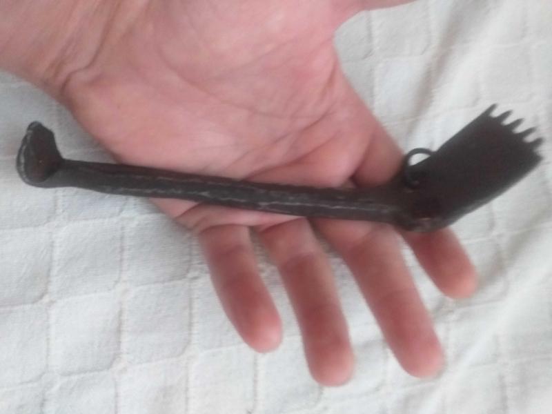 tekke işi def+kudüm çalma aleti 2... vurmalı çalgılar çalınırken kullanılan vurma aleti , yanlardaki deliklere takılı metal halkalar kullanım sırasında çınlamaya benzer ekstra bir ses çıkartır... Dövme demir işçiliği muazzam , uç alt kısımda hayat ağacı motifi gömme olarak işlenmiş... Müzik el aleti , ethnografik sanat , ethnografic art , folk art...
