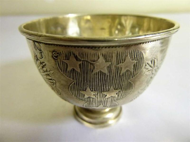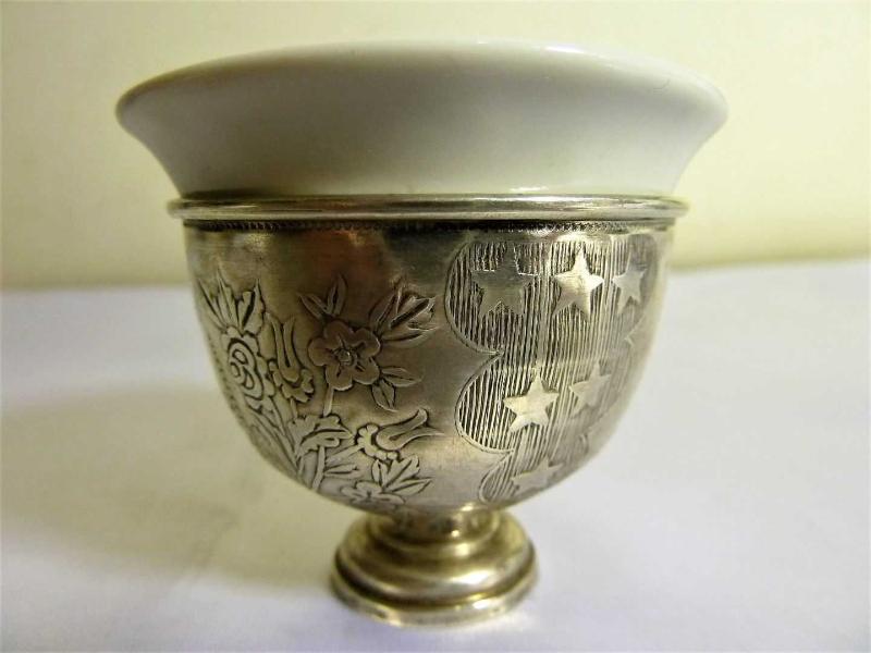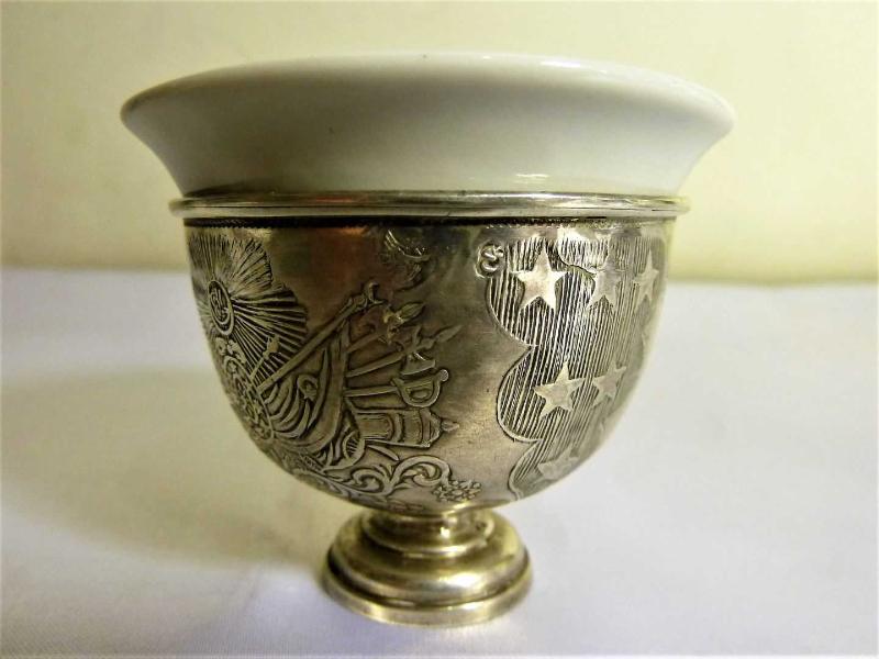 Osmanlı tuğralı,sah damgalı, porselen fincanlı, gümüş zarf. Y 4,5cm. Ağız çapı.5,5cm. başlıklı antika/koleksiyon objesinin menşei belirtilmemiştir. 1800-1849 arası dönemine aittir.