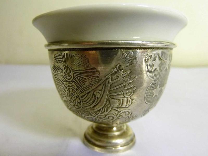 Osmanlı tuğralı,sah damgalı, porselen fincanlı, gümüş zarf. Y 4,5cm. Ağız çapı.5,5cm., en son 2 ay önce güncellenmiştir.