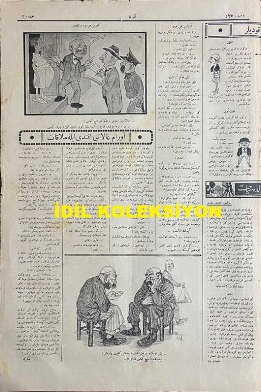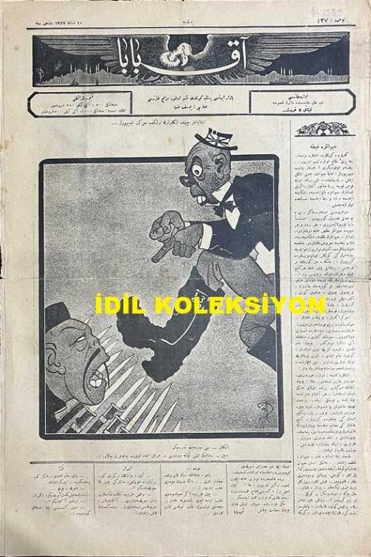 Osmanlıca Akbaba Mizah Dergisi-Gazetesi, Orijinal Dönem Basım, (Ottoman Magazine-Newspaper) - 10 Şubat 1927 - Sayı: 437 - Karikatürist Ramiz Gökçe'nin Çalışması: İtalyanlar Çin'de İngilizlerle Birlikte Hareket Ediyorlar... "İngiliz: Seni Çizmemle Ezeceğim! Çin: Madem ki İş Ayağa Düştü, Merak Etme, Onu da Çabuk Parçalarız!..." - Hayvanlara Gıpta "Kedilere, Köpeklere, Eşeklere Müjde!.. Himaye-i Hayvanat Cemiyeti Teşkil Etmiş, Şişli'de Elli Bin Liraya Koskoca Bir Bina Satın Almışlar.. Meğer Bu Dünyada Hayvan Olmak Kadar Büyük Saadet Yokmuş!" Akbaba - "Ferman" Horoz - Dedikodular: Florinalı Nazım, Faruk Nafiz (Çamlıbel) Bey, Nezihe Muhittin Hanım, Aka Gündüz Bey - Manzum Tefrika: "İstanbul'da Hayat" Nazımı: Necdet Rüştü (Efe) - Karikatürist Ramiz Gökçe'nin Çalışması: Tahrir-i Nüfusta Müşkülat - "Avram Galanti Efendi ile Mülakat" Çekirge (Ercüment Ekrem Talu) - Akbaba'nın Tefrikası: "Gün Doğmayınca" Muharriri: Ercüment Ekrem (Talu) adlı eser, Kitap > Süreli Yayınlar > Gazeteler > Türkiye > Genel kategorisinde İkinci El olarak satıştadır.