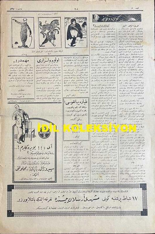 Osmanlıca Akbaba Mizah Dergisi-Gazetesi, Orijinal Dönem Basım, (Ottoman Magazine-Newspaper) - 10 Şubat 1927 - Sayı: 437 - Karikatürist Ramiz Gökçe'nin Çalışması: İtalyanlar Çin'de İngilizlerle Birlikte Hareket Ediyorlar... "İngiliz: Seni Çizmemle Ezeceğim! Çin: Madem ki İş Ayağa Düştü, Merak Etme, Onu da Çabuk Parçalarız!..." - Hayvanlara Gıpta "Kedilere, Köpeklere, Eşeklere Müjde!.. Himaye-i Hayvanat Cemiyeti Teşkil Etmiş, Şişli'de Elli Bin Liraya Koskoca Bir Bina Satın Almışlar.. Meğer Bu Dünyada Hayvan Olmak Kadar Büyük Saadet Yokmuş!" Akbaba - "Ferman" Horoz - Dedikodular: Florinalı Nazım, Faruk Nafiz (Çamlıbel) Bey, Nezihe Muhittin Hanım, Aka Gündüz Bey - Manzum Tefrika: "İstanbul'da Hayat" Nazımı: Necdet Rüştü (Efe) - Karikatürist Ramiz Gökçe'nin Çalışması: Tahrir-i Nüfusta Müşkülat - "Avram Galanti Efendi ile Mülakat" Çekirge (Ercüment Ekrem Talu) - Akbaba'nın Tefrikası: "Gün Doğmayınca" Muharriri: Ercüment Ekrem (Talu), Yusuf Ziya (ORTAÇ) tarafından kaleme alınmıştır. Kitap 1927 yılında [İstanbul] yayınlanmıştır. Satışta olan kitap, yayınevinin 437. baskısıdır. 4 sayfadır. Osmanlıca Akbaba Mizah Dergisi-Gazetesi, Orijinal Dönem Basım, (Ottoman Magazine-Newspaper) - 10 Şubat 1927 - Sayı: 437 - Karikatürist Ramiz Gökçe'nin Çalışması: İtalyanlar Çin'de İngilizlerle Birlikte Hareket Ediyorlar... "İngiliz: Seni Çizmemle Ezeceğim! Çin: Madem ki İş Ayağa Düştü, Merak Etme, Onu da Çabuk Parçalarız!..." - Hayvanlara Gıpta "Kedilere, Köpeklere, Eşeklere Müjde!.. Himaye-i Hayvanat Cemiyeti Teşkil Etmiş, Şişli'de Elli Bin Liraya Koskoca Bir Bina Satın Almışlar.. Meğer Bu Dünyada Hayvan Olmak Kadar Büyük Saadet Yokmuş!" Akbaba - "Ferman" Horoz - Dedikodular: Florinalı Nazım, Faruk Nafiz (Çamlıbel) Bey, Nezihe Muhittin Hanım, Aka Gündüz Bey - Manzum Tefrika: "İstanbul'da Hayat" Nazımı: Necdet Rüştü (Efe) - Karikatürist Ramiz Gökçe'nin Çalışması: Tahrir-i Nüfusta Müşkülat - "Avram Galanti Efendi ile Mülakat" Çekirge (Ercüment Ekrem Talu) - Akbaba'nın Tefrikası: "Gün Doğmayınca" Muharriri: Ercüment Ekrem (Talu) adlı eser Osmanlıca dilindedir.