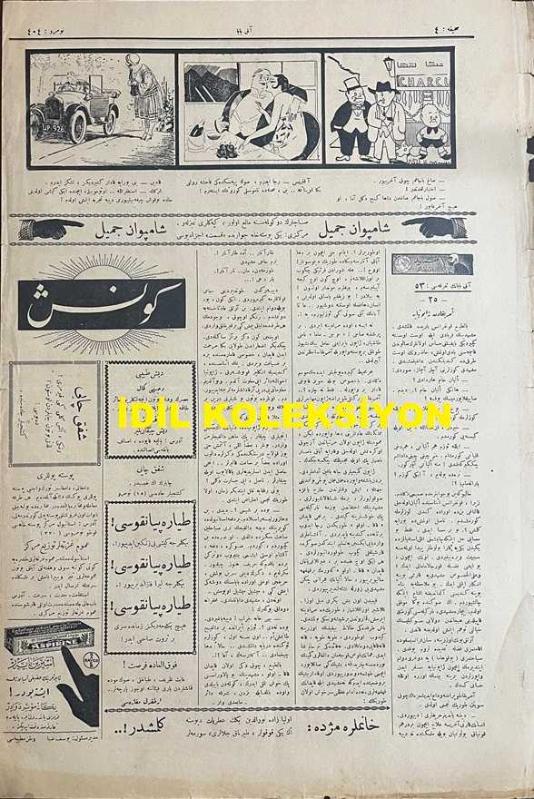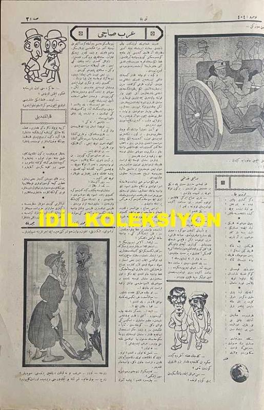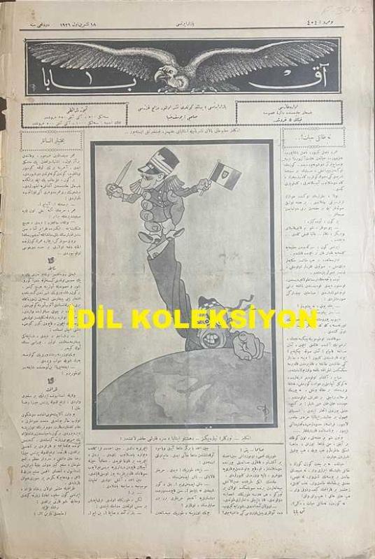 Osmanlıca Akbaba Mizah Dergisi-Gazetesi, Orijinal Dönem Basım, (Ottoman Magazine-Newspaper) - 18 Ekim (Teşrin-i Evvel) 1926 - Sayı: 404 - Karikatürist Ramiz Gökçe'nin Çalışması: İngiliz Matbuatı Yalan Neşriyatıyla İtalya'yı Aleyhimize Kışkırtmak İstiyor... "İngiliz: Türkler! Titreyiniz.. Dehşetli İtalya, Size Karşı Hazırlanmıştır!" - Ne Tatlı Hayat!.. - "Denizin Dili" Çimdik - Karikatürist Ramiz Gökçe'nin Sultan II. Abdülhamit'i Tasvir Eden Çalışması: Yıldız Sefahet ve Kumarhanesinde "Abdülhamit'in Ruhu: Oh... Oh... Ne Ala, Burada Hala Benim Tarz-ı İdarem Hüküm Sürüyor!" - "Yüzüncüyü Tes'id" Selami İzzet (Sedes) - Karikatürist Ramiz Gökçe'nin Çalışması: Kahraman Kıtaatımız Ankara Manevralarından Dönerken... "Vazifemizi İyi Yapıp Yapmadığımızı Anlamak için Manevraya Gittik.. Onu Dört Sene Evvel İsbat Etmiştik Ya!.." - "Arap Saçı" Ercüment Ekrem (Talu) - Akbaba'nın Tefrikası: Meşhedi ile Devr-i Alem "Amerika'dan Japonya'ya" - Dış Basından Karikatürler adlı eser, Kitap > Süreli Yayınlar > Gazeteler > Türkiye > Genel kategorisinde İkinci El olarak satıştadır.