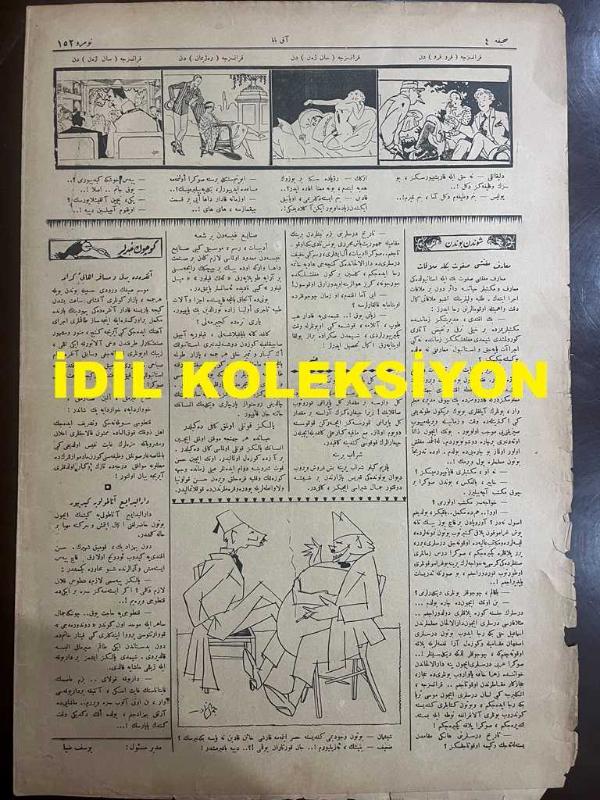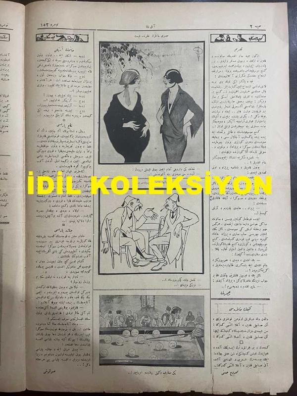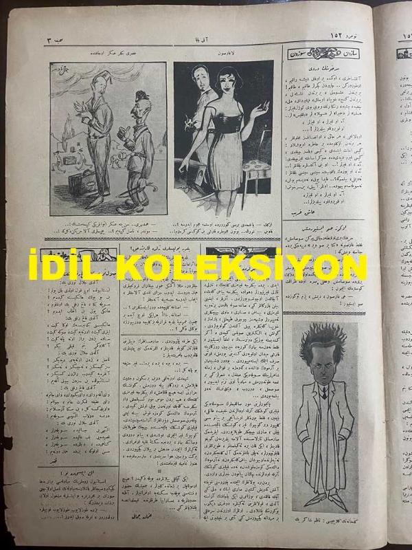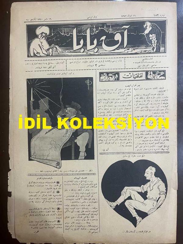 Osmanlıca Akbaba Mizah Dergisi-Gazetesi, Orijinal Dönem Basım, (Ottoman Magazine-Newspaper) - 19 Mayıs 1924 - Sayı: 152 - Rumi: 19 Mayıs 1340 - Hicri: 16 Şevval 1342 - Karikatürist Ramiz Gökçe'nin Musul Meselesini Konu Alan Çalışması: Bugün Açılacak Musul Konferansında - Karikatür: Eski Darb-ı Mesellerin Yeni Medlulü "Her Kızın Kalbinde Bir Aslan Yatar!..." - Laklakiyat: "Ba'de Harabü'-l-Basra" İttihat ve Terakki'nin Önde Gelen Kişilerinden Kara Kemal (Zülüflü ve Küçük Efendi Olarak Maruf) Hakkında Açılan Davaya Dair: "Şahidi Kalmayan Bu Dava Neden Açıldı? Zira, İttihat ve Terakki İaşesinin Sekiz Sene Evvel Aç ve Çıplak Bıraktığı İnsanlar Toprak Altında Çürüdüler Bile!.. - Gençlik Hatırası (Manzum) Memduh Hüsnü - Karikatür: Gülhane'nin Güllabicisi: Nazım Şakir (Şakar) - Celal Nuri Bey'le Falih Rıfkı Bey'in Müşaareleri - Cemal Nadir Güler'in Erken Dönem Karikatürlerinden Örnekler - Şundan Bundan: Maarif Müfettişi Safvet Bey'le Mülakat - Darülbedayi Anadolu'ya Gidiyor, Orhan Seyfi (ORHON) tarafından kaleme alınmıştır. Kitap 1924 [Hicri: 1342] [Rûmi: 1340] yılında [İstanbul] yayınlanmıştır. Satışta olan kitap, yayınevinin 152. baskısıdır. 4 sayfadır. Osmanlıca Akbaba Mizah Dergisi-Gazetesi, Orijinal Dönem Basım, (Ottoman Magazine-Newspaper) - 19 Mayıs 1924 - Sayı: 152 - Rumi: 19 Mayıs 1340 - Hicri: 16 Şevval 1342 - Karikatürist Ramiz Gökçe'nin Musul Meselesini Konu Alan Çalışması: Bugün Açılacak Musul Konferansında - Karikatür: Eski Darb-ı Mesellerin Yeni Medlulü "Her Kızın Kalbinde Bir Aslan Yatar!..." - Laklakiyat: "Ba'de Harabü'-l-Basra" İttihat ve Terakki'nin Önde Gelen Kişilerinden Kara Kemal (Zülüflü ve Küçük Efendi Olarak Maruf) Hakkında Açılan Davaya Dair: "Şahidi Kalmayan Bu Dava Neden Açıldı? Zira, İttihat ve Terakki İaşesinin Sekiz Sene Evvel Aç ve Çıplak Bıraktığı İnsanlar Toprak Altında Çürüdüler Bile!.. - Gençlik Hatırası (Manzum) Memduh Hüsnü - Karikatür: Gülhane'nin Güllabicisi: Nazım Şakir (Şakar) - Celal Nuri Bey'le Falih Rıfkı Bey'in Müşaareleri - Cemal Nadir Güler'in Erken Dönem Karikatürlerinden Örnekler - Şundan Bundan: Maarif Müfettişi Safvet Bey'le Mülakat - Darülbedayi Anadolu'ya Gidiyor adlı eser Osmanlıca dilindedir.