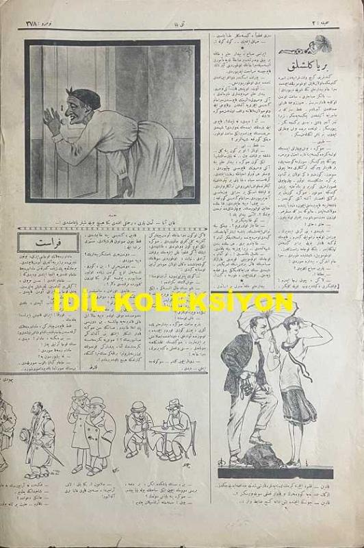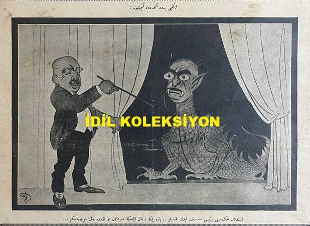 Osmanlıca Akbaba Mizah Dergisi-Gazetesi, Orijinal Dönem Basım, (Ottoman Magazine-Newspaper) - 19 Temmuz 1926 - Sayı: 378 - Karikatürist Ramiz Gökçe'nin İstiklal Mahkemeleri Yargılamalarına Dair Mahkeme Başkanı Ali Çetinkaya'yı Tasvir Eden Çalışması: İkinci Perde Ankara'da Açılıyor: "İstiklal Mahkemesi Reisi: Dikkat Edin Efendiler... Para Yemeye, Kan İçmeye Doymayan Bu Ejdere (İttihat ve Terakki) Neler Söyleteceğim!..." - Akisler: Şeker İnhisarı "Ne Vakit Şeker Bahsi Açılsa, Aklıma Vesika Ticareti Gelir. Ne Vakit Kara Kemal'in İsmini Duysam, Fikrimden İaşe Nezareti ve Rezaleti Geçer. Ne Zaman Hüseyin Cahit Bey'in İsmini İşitsem Hatırımda Men-i İhtikar Cemiyeti Canlanır. O Kara Kemal'in Suratı Gibi Kara, Zülüflü Gibi Yağlı, Vicdanı Gibi Mağşuş Tava Ekmeğini Hatırlarım. Parasızlıktan Acı Acı Düşündüğümüz, Şekersizlikten Tatlı Tatlı Kaşındığımız Günler" - Yahudi Karikatürleri - "Bir Yanlışlık" Karga - Akbaba'nın Tefrikası: Meşhedi ile Devr-i Alem adlı eser, Kitap > Süreli Yayınlar > Gazeteler > Türkiye > Genel kategorisinde İkinci El olarak satıştadır.