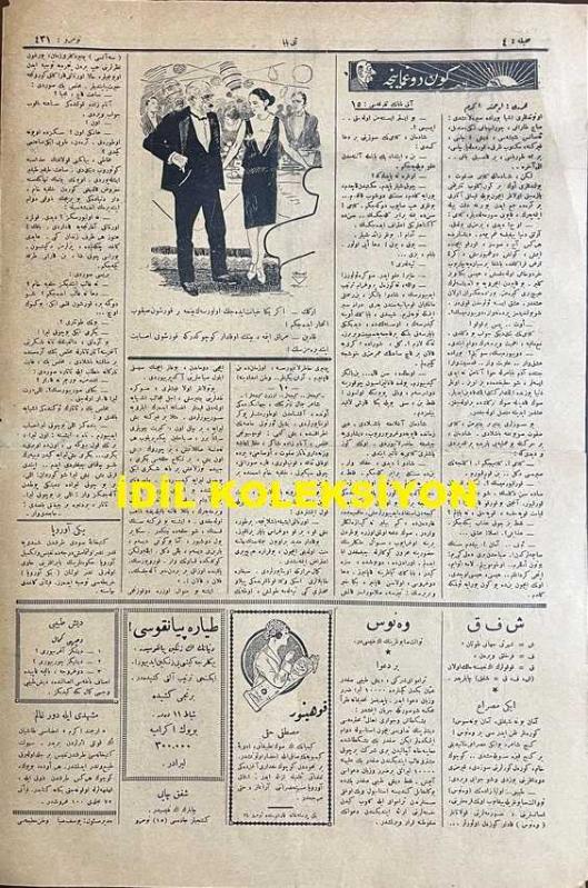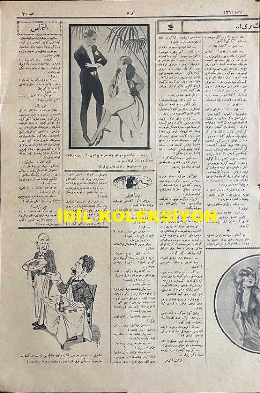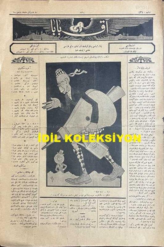 Osmanlıca Akbaba Mizah Dergisi-Gazetesi, Orijinal Dönem Basım, (Ottoman Magazine-Newspaper) - 20 Ocak (Kanun-i Sani) 1927 - Sayı: 431 - Karikatürist Ramiz Gökçe'nin Çalışması: İngiltere, İtalya ve Yunanistan'ı Teşvik Ederek Balkan İşlerine Karışıyor... "Dünya: Nereye Böyle? İngiliz: Balkanlarda Harp Parlamak Üzere İmiş, Onu Söndürmeye Gidiyorum!.." - Şerif Baba'ya Dair "Malülin-i Askeriyeden Necati Bey'e On Bin Lira Kazandıran Tayyare Piyangosu Biletinin Eski Sahibi Şerif Baba, Artık Önüne Gelene Uzun Uzun Dert Yanıyor" Akbaba - "Ankara Mektubu" Serkenkebin Efendi (Aka Gündüz) - "Meşhedi'nin Fili" Çekirge (Ercüment Ekrem Talu) - "Herzevekilin Biri!.." Ercüment Ekrem (Talu) - Akbaba'nın Tefrikası: "Gün Doğmayınca" Ercüment Ekrem (Talu) - İhap Hulusi Görey'in Çalışması: "Erkek: Eğer Bana Hıyanet Edecek Olursan Beynime Bir Kurşun Sıkıp İntihar Edeceğim! Kadın: Merak Etme, Beynin O Kadar Küçüktür ki Kurşun İsabet Ettiremezsin!", Yusuf Ziya (ORTAÇ) tarafından kaleme alınmıştır. Kitap 1927 yılında [İstanbul] yayınlanmıştır. Satışta olan kitap, yayınevinin 431. baskısıdır. 4 sayfadır. Osmanlıca Akbaba Mizah Dergisi-Gazetesi, Orijinal Dönem Basım, (Ottoman Magazine-Newspaper) - 20 Ocak (Kanun-i Sani) 1927 - Sayı: 431 - Karikatürist Ramiz Gökçe'nin Çalışması: İngiltere, İtalya ve Yunanistan'ı Teşvik Ederek Balkan İşlerine Karışıyor... "Dünya: Nereye Böyle? İngiliz: Balkanlarda Harp Parlamak Üzere İmiş, Onu Söndürmeye Gidiyorum!.." - Şerif Baba'ya Dair "Malülin-i Askeriyeden Necati Bey'e On Bin Lira Kazandıran Tayyare Piyangosu Biletinin Eski Sahibi Şerif Baba, Artık Önüne Gelene Uzun Uzun Dert Yanıyor" Akbaba - "Ankara Mektubu" Serkenkebin Efendi (Aka Gündüz) - "Meşhedi'nin Fili" Çekirge (Ercüment Ekrem Talu) - "Herzevekilin Biri!.." Ercüment Ekrem (Talu) - Akbaba'nın Tefrikası: "Gün Doğmayınca" Ercüment Ekrem (Talu) - İhap Hulusi Görey'in Çalışması: "Erkek: Eğer Bana Hıyanet Edecek Olursan Beynime Bir Kurşun Sıkıp İntihar Edeceğim! Kadın: Merak Etme, Beynin O Kadar Küçüktür ki Kurşun İsabet Ettiremezsin!" adlı eser Osmanlıca dilindedir.