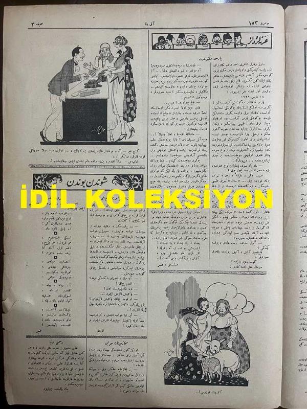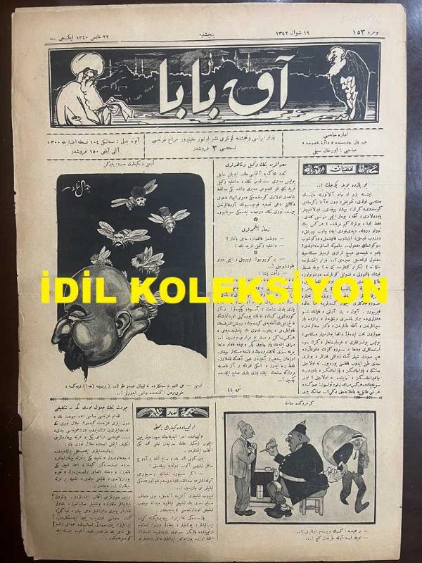 Osmanlıca Akbaba Mizah Dergisi-Gazetesi, Orijinal Dönem Basım, (Ottoman Magazine-Newspaper) - 22 Mayıs 1924 - Sayı: 153 - Rumi: 22 Mayıs 1340 - Hicri: 19 Şevval 1342 - Laklakiyat: Bu Yaz da Böyle Geçecek! Firari Ermeniler Meselesinin Manasızlığına Dair - Zamane Bilmeceleri - Cemal Nadir Güler'in Karikatürü: Ermeni Zenginleri Sızdırılırken - Fıkralar: Olimpiyatçıların Yemini: Olimpiyatta İcra Edilecek Sporcular Yemini için Bizimkiler Galatasaray'dan Leblebi Mehmet'i İntihap Etmişlerdir - İkdam Gazetesi Sahibi Ahmet Cevdet Bey'in İleri Gazetesi Sahibi Celal Nuri Bey'e Teklifi - Küçük Hikaye: "Mükafat Yerine" Yusuf Ziya (Ortaç) - Kısa Hikaye: Kaptanın Feraseti - Kumarbazın Dostluğu - Cemal Nadir Güler'in İki Karikatürü - Gazetelere Dair: Paris Mektupları - Sirozlu Hoca'nın Bıçağı - Asri İzdivaç İlanları - Dış Basından Karikatürler