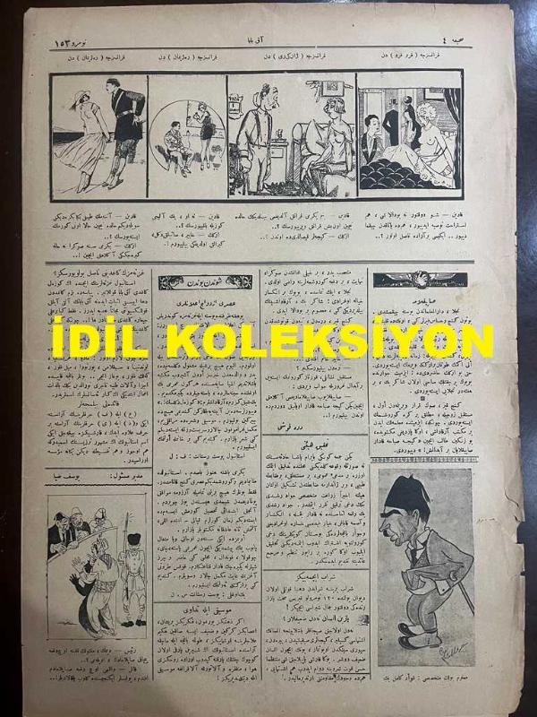 Osmanlıca Akbaba Mizah Dergisi-Gazetesi, Orijinal Dönem Basım, (Ottoman Magazine-Newspaper) - 22 Mayıs 1924 - Sayı: 153 - Rumi: 22 Mayıs 1340 - Hicri: 19 Şevval 1342 - Laklakiyat: Bu Yaz da Böyle Geçecek! Firari Ermeniler Meselesinin Manasızlığına Dair - Zamane Bilmeceleri - Cemal Nadir Güler'in Karikatürü: Ermeni Zenginleri Sızdırılırken - Fıkralar: Olimpiyatçıların Yemini: Olimpiyatta İcra Edilecek Sporcular Yemini için Bizimkiler Galatasaray'dan Leblebi Mehmet'i İntihap Etmişlerdir - İkdam Gazetesi Sahibi Ahmet Cevdet Bey'in İleri Gazetesi Sahibi Celal Nuri Bey'e Teklifi - Küçük Hikaye: "Mükafat Yerine" Yusuf Ziya (Ortaç) - Kısa Hikaye: Kaptanın Feraseti - Kumarbazın Dostluğu - Cemal Nadir Güler'in İki Karikatürü - Gazetelere Dair: Paris Mektupları - Sirozlu Hoca'nın Bıçağı - Asri İzdivaç İlanları - Dış Basından Karikatürler adlı eser, Kitap > Süreli Yayınlar > Gazeteler > Türkiye > Genel kategorisinde İkinci El olarak satıştadır.