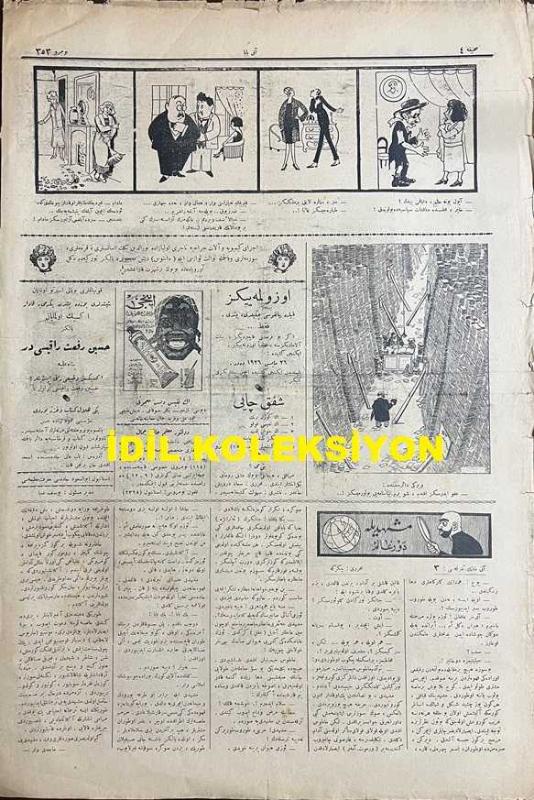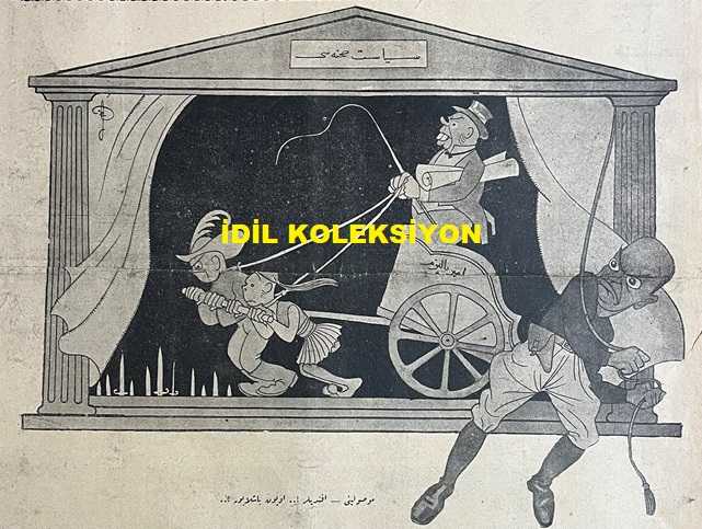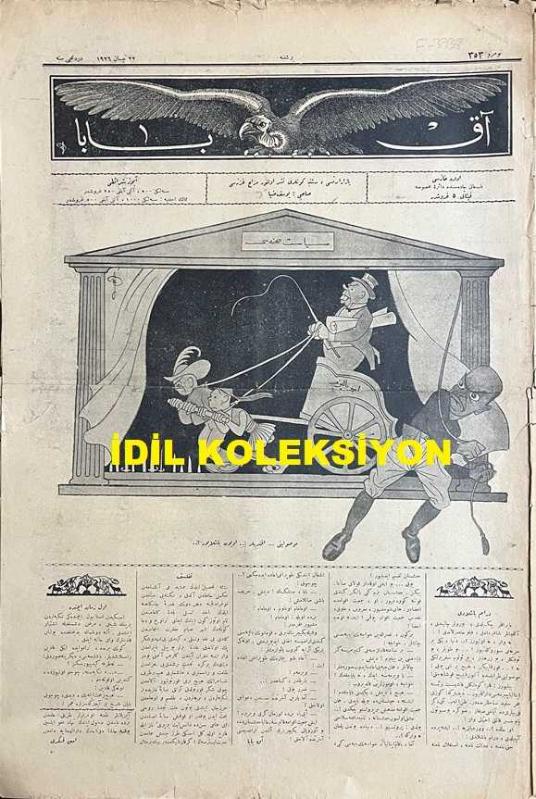 Osmanlıca Akbaba Mizah Dergisi-Gazetesi, Orijinal Dönem Basım, (Ottoman Magazine-Newspaper) - 22 Nisan 1926 - Sayı: 353 - Karikatürist Ramiz Gökçe'nin Benito Mussolini'yi Tasvir Eden Çalışması: Siyaset Sahnesi "Mussolini: Efendiler!... Oyun Başlıyor!..." - Dram Başladı "İş Cemiyet-i Akvam'a Kalırsa, Galiba Habeşistan da, Bu Avrupalı Yeniçerilerin Elinden Arazisini Ahirette Alacak!" - "Tefelsüf" Neş'e Tahsil Eyledik Cemşid mi Aşamdan Hikmeti Hafız'dan Aldık, Nükteyi Hayyam'dan (...) Emin Fikri - "Kadın" Necdet Rüştü (Efe) - Fıkralar - Karikatür: Zevce: Yirmi Sene Evvel İzdivaç Piyangosunda Tali'in Yardım Etti, Beni Kazandın... Fakat Bu Sefer Tayyare Piyangosunda.. Zevc: Tali'im Daha Çok Yardım Etti Karıcığım: Yirmi Beş Kuruş Kazandım - "Bir İntihar" Ercüment Ekrem (Talu) - Akbaba'nın Tefrikası: Meşhedi ile Devr-i Alem, Muharriri: Çekirge (Ercüment Ekrem Talu) - Dış Basından Karikatürler adlı eser, Kitap > Süreli Yayınlar > Gazeteler > Türkiye > Genel kategorisinde İkinci El olarak satıştadır.