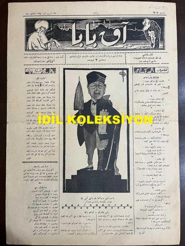 Osmanlıca Akbaba Mizah Dergisi-Gazetesi, Orijinal Dönem Basım, (Ottoman Magazine-Newspaper) - 27 Kasım 1924 - Sayı: 207 - Rumi: 27 Teşrin-i Sani 1340 - Karikatürist Ramiz Gökçe'nin Ali Fethi Okyar Temalı Çalışması: Başvekil ve Müdafaa-i Milliye Vekili Fethi Bey Mecliste Hükümet Beyannamesini Okurken! - Laklakiyat: Haftanın Panoraması - Refik Halit (Karay)'in Bir Nüktesi Daha: Edebiyat-ı Cedide Erkanından Ali Ekrem (Bolayır) Bey Hakkında Refik Halit Merhumun Zarif Bir Sözünü Hikaye Ettiler - Küçük Hikaye: Prensin Gözdesi - Üstad-ı Azam'ın Bir Nüktesi: Florinalı Nazım Bey, Üstad-ı Azam Abdülhak Hamit (Tarhan)'e Bundan Birkaç Ay Evvel, Yeni Bir Eserini Götürüp Bir Takriz Yazmasını Rica Eder - Ratip Tahir Burak'ın Karikatürleri - Zamane Hizmetçileri - Tahir Nadi Efendi'nin Kurnazlığı - Fransızca Sourire'den Bir Karikatür "Namuslu Kadınlarla Aramızda Büyük Bir Fark Yok" - Ecnebi Karikatürleri adlı eser, Kitap > Süreli Yayınlar > Gazeteler > Türkiye > Genel kategorisinde İkinci El olarak satıştadır.
